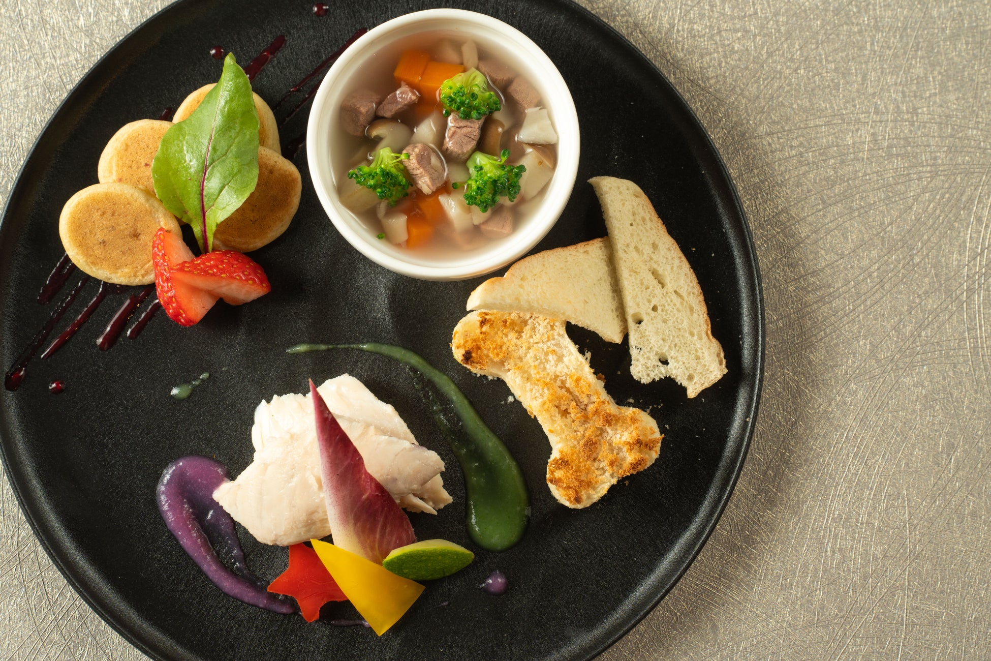 乾燥期の潤いや免疫・腸内環境・滋養・温める力に配慮し、地魚のメイン、米粉仕立てのブランダード、そば粉と卵+ヨーグルトのデザート、猪とレンコンのスープを一皿に構成しています。
