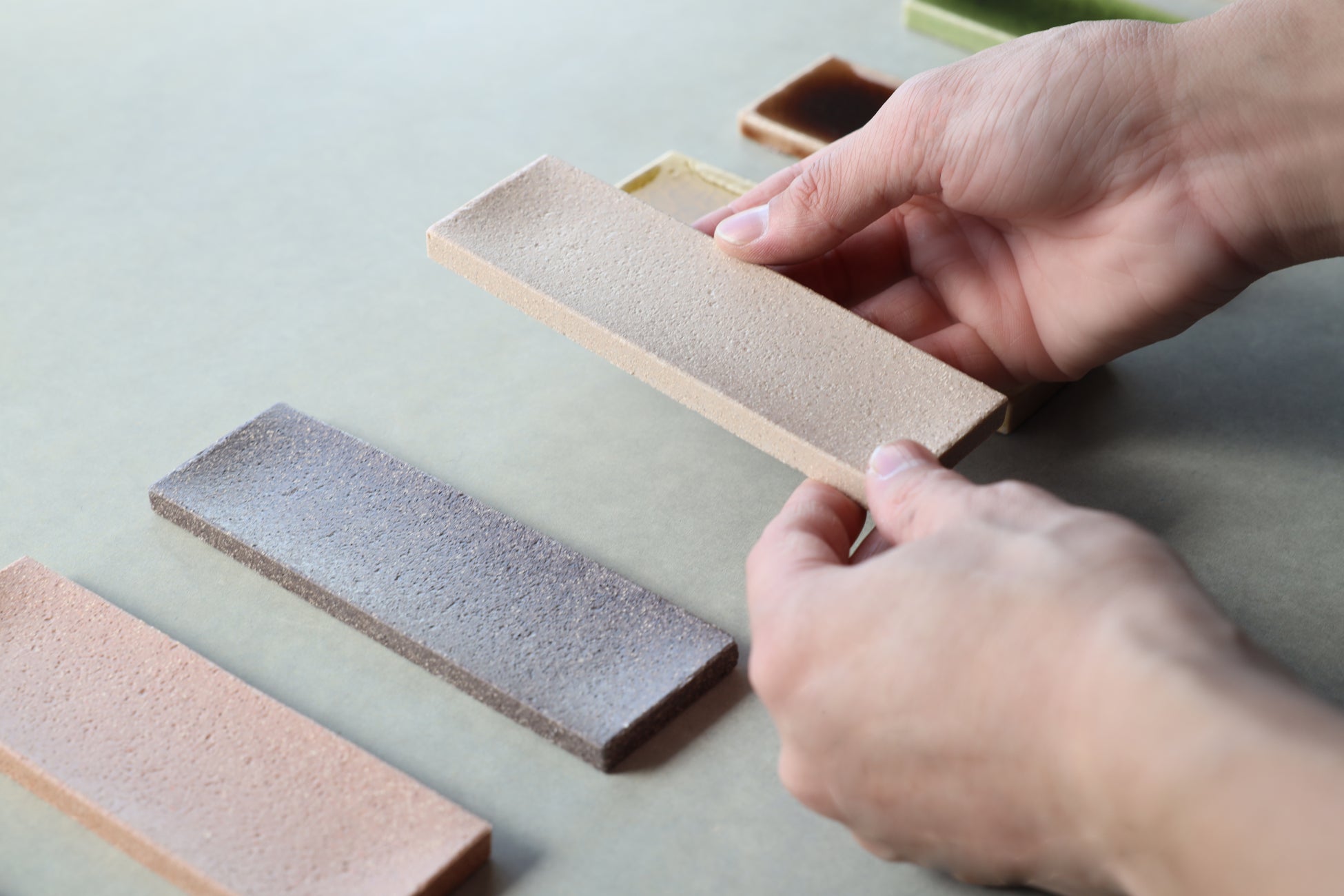 家電の製造過程で出る断熱材グラスウールの端材と粘土鉱山から出る廃棄物を組み合わせることでリサイクル率100%のタイルを開発しました。釉薬にも廃棄グラスウールを使用しています。