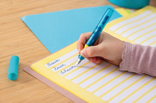 初心者にも使いやすい万年筆を。185年以上の歴史を有するドイツの高級筆記具ブランド「ペリカン」が学童用に開発した「ペリカーノ・ジュニア」は、少し太めでなめらかに書けるペン先と、カラフルなデザインが人気となり、学童用としてだけでなく、初めての万年筆をお探しの方、気兼ねなく使える万年筆をお探しの方、ちょっとしたプレゼントにも。様々な用途に選ばれています。右利きに最適な「A」(ドイツ語で初心者を意味する単語【Anfänger /アンフェンガー】の頭文字)のペン先と左利き用「L」のペン先2種類をご用意。人間工学(エルゴノミクス)に基づき握りやすく設計されたソフトグリップは、わずかなくぼみが利き手に応じた角度でフィットし、指の滑りを防止。正しいペングリップを自然にサポートします。更にキャップには製品名「Pelikano」の文字の浮かせ加工を施し、キャップが転がり落ちることを防止しています。