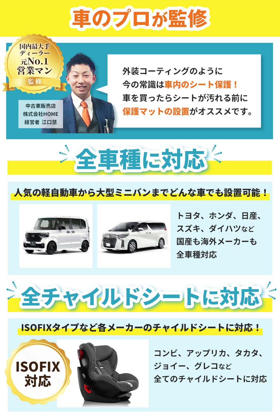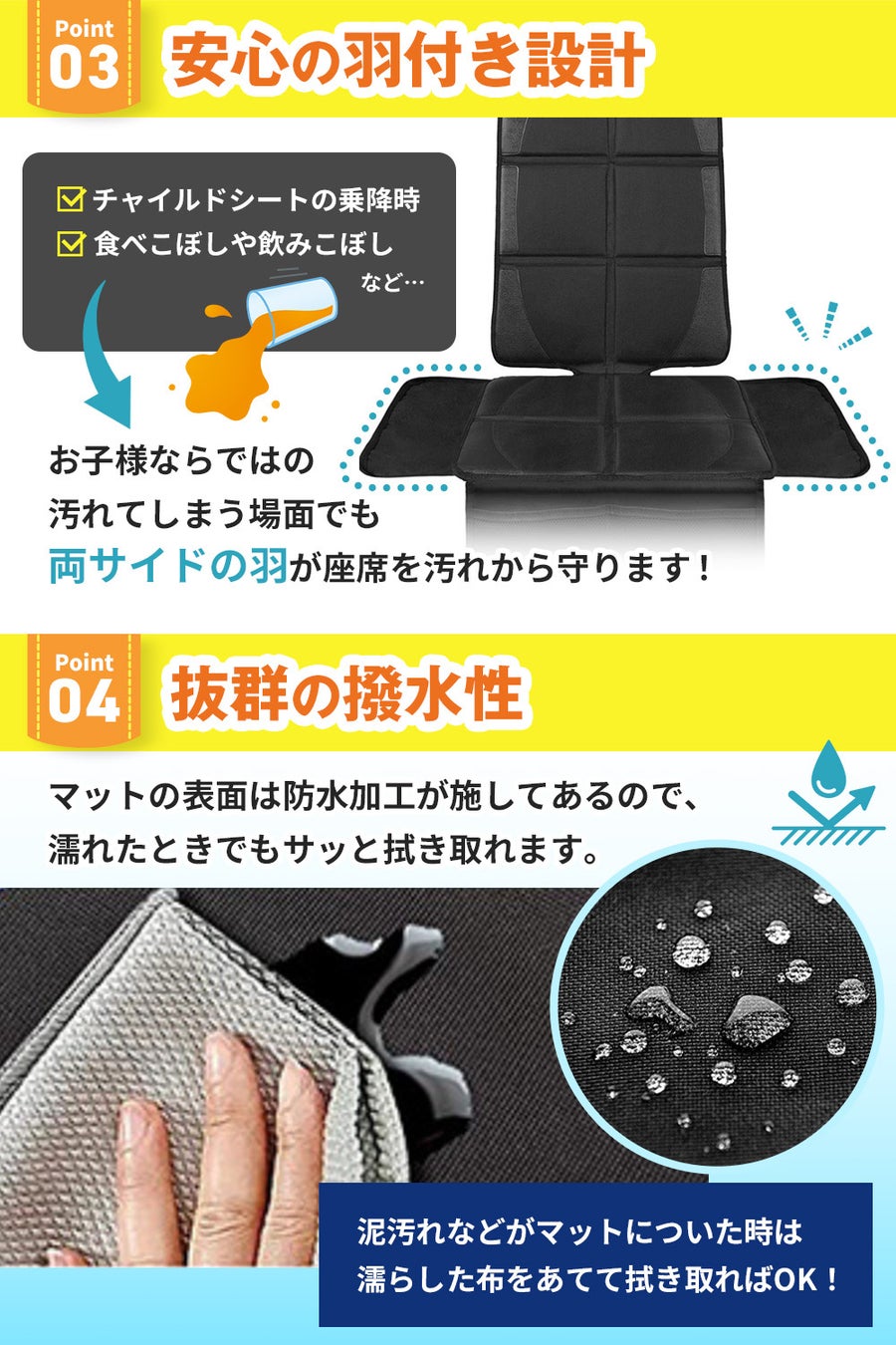 シンプルなデザインで高級感のある車内をキープしながら、チャイルドシートによるシートのへこみや傷を極厚のクッションで防ぎます。