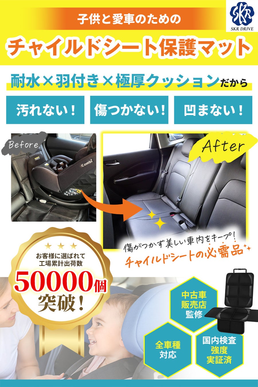 SKR DRIVEは、「車を快適に・美しく・安全に」をコンセプトに、運転の悩みを解決するカー用品を提供するブランドです。今回発売の「チャイルドシート保護マット」は、シートの保護だけでなく、お子様とのドライブをより快適にするアイテムとして設計されています。