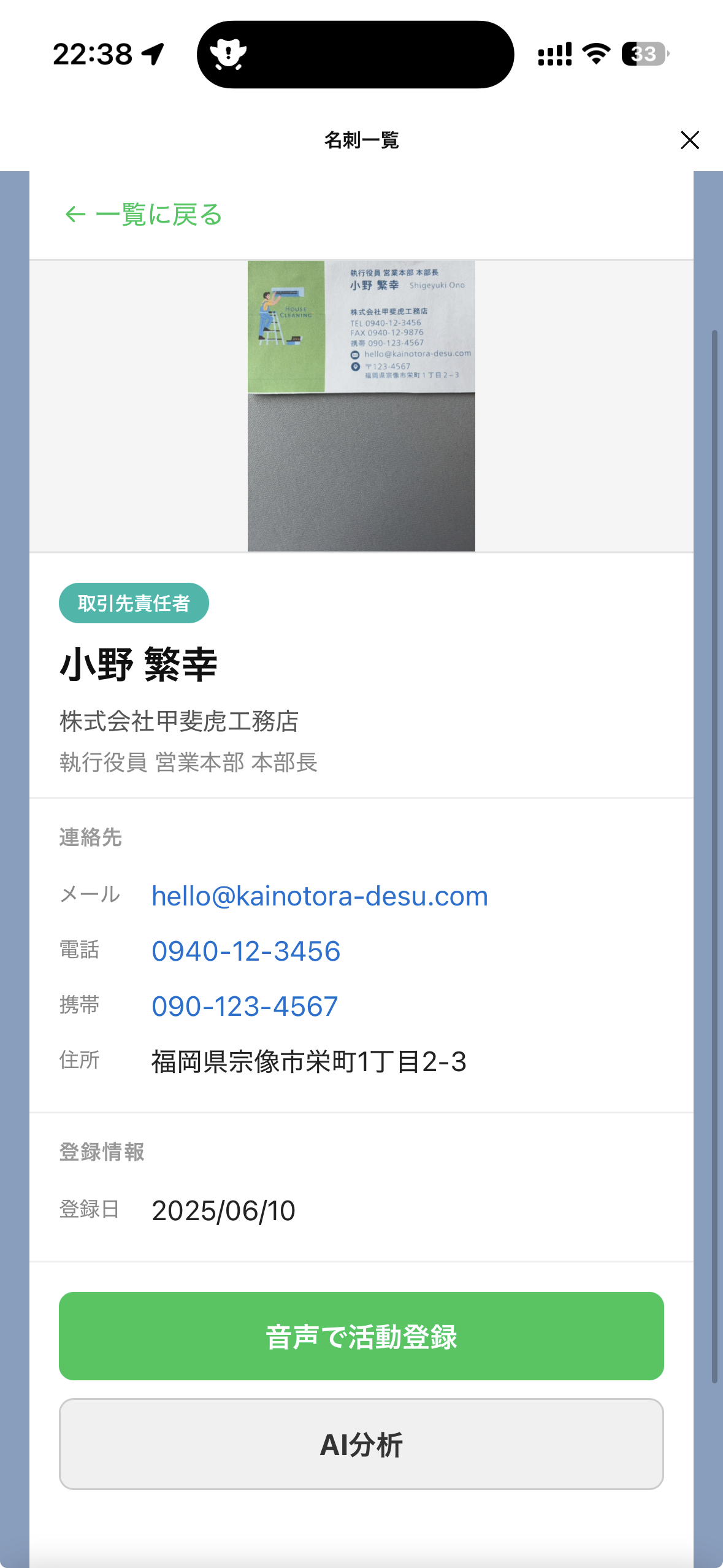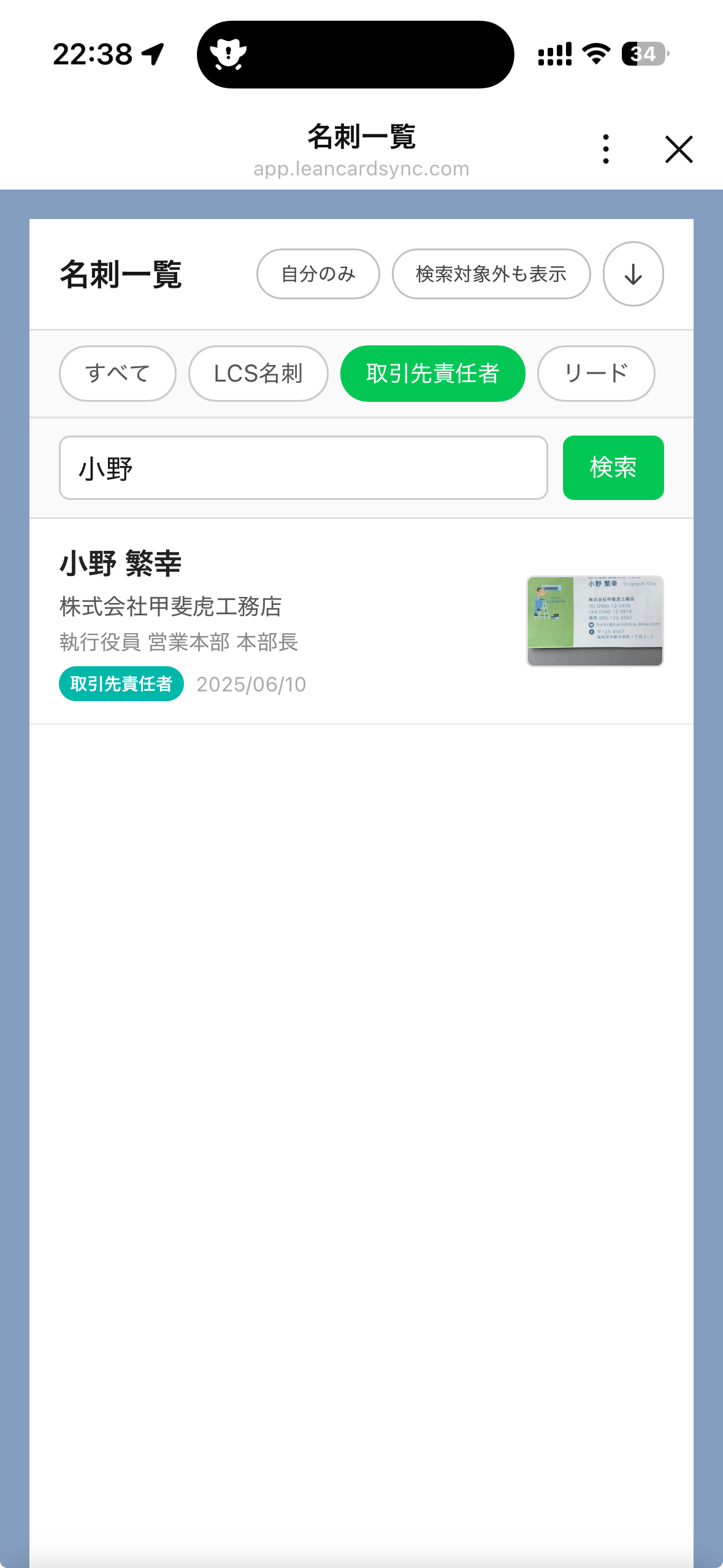 表示切り替え: 「自分が登録した名刺のみ」と「社内のすべての名刺」の表示をワンタップで切り替えられ、目的の名刺をすぐに見つけ出せます。