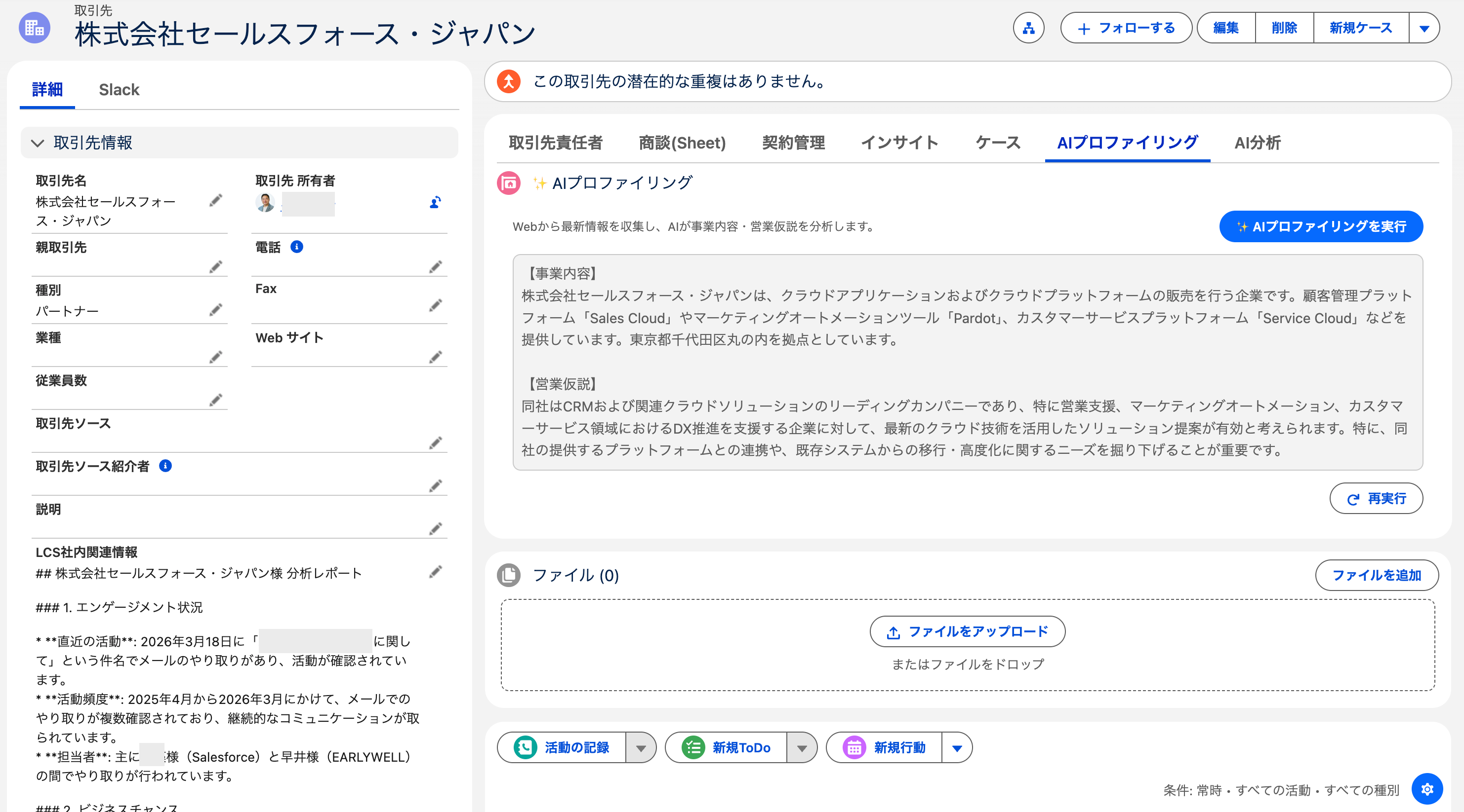 重複チェック: Salesforce内にすでに同じ人物や企業がいないか、AIが重複候補を自動でチェックして表示するため、データの二重登録を防ぎます。