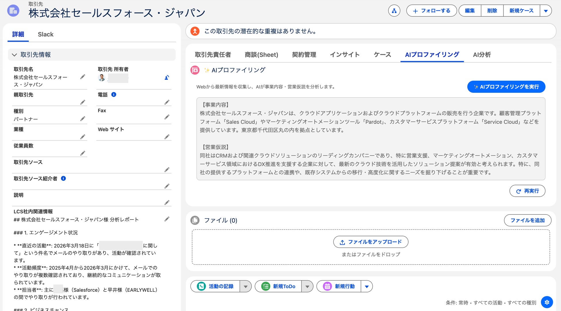 Salesforceの取引先画面に新設された「✨ AIプロファイリングを実行」ボタンを押すと、AIがインターネット上の最新情報(自社サイトやニュースなど)を自動で検索・収集・分析します。