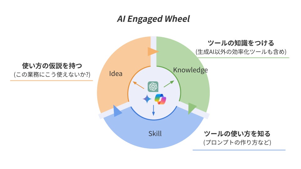 本診断は、これまで50社以上の企業様に生成AIの導入コンサルティングを提供してきた経験から生まれた、独自フレームワーク『AI Engaged Wheel』に基づいています。AIを本当に使いこなし、成果を出すために不可欠な3つの要素を、バランス良く評価します。
