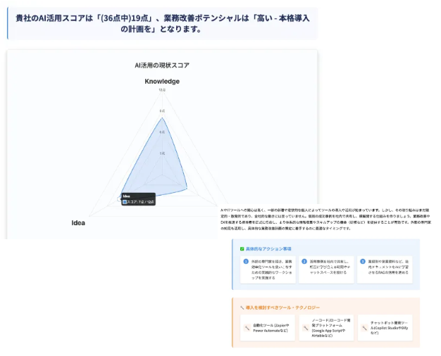 強み・弱みの可視化: 独自のフレームワークに基づき、あなたの会社の「ツールの知識」「使いこなすスキル」「改善アイデアの発想力」を分析。強みと弱みをレーダーチャートで分かりやすく可視化し、どこから手をつけるべきかを明確にします。