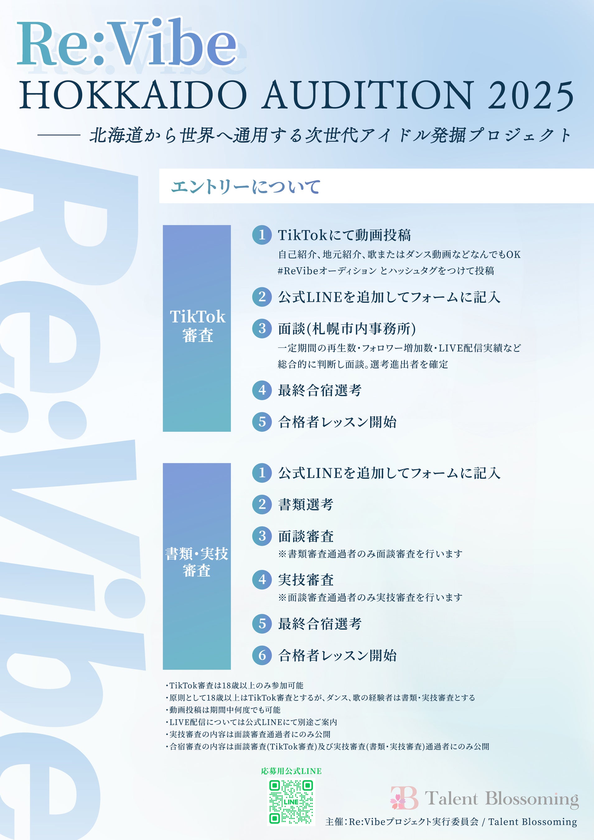 Re:Vibeプロジェクト実行委員会(主催:Talent Blossoming)は、北海道の地から世界を舞台に活躍できる次世代型アイドルを発掘・育成する新プロジェクト「Re:Vibe HOKKAIDO AUDITION 2025」を開催いたします。本オーディションは、デジタルネイティブ世代のSNS発信力と地元愛を基軸に選考する、参加型・地域密着型の全く新しいスタイルの発掘プロジェクトです。