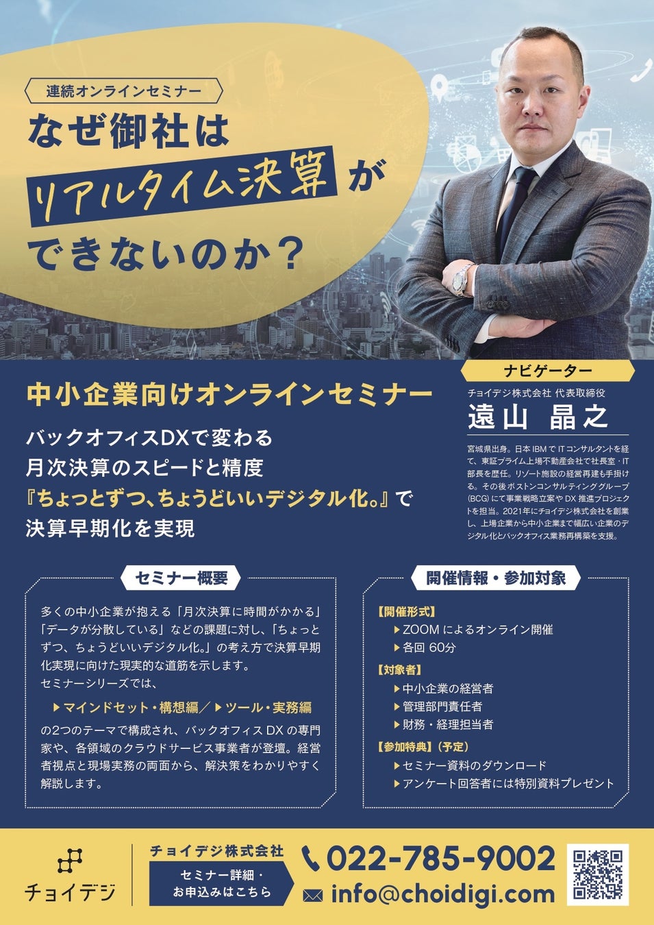 チョイデジ株式会社(本社:宮城県仙台市、代表取締役:遠山晶之)は、中小企業のバックオフィスDXを支援する連続オンラインセミナー「なぜ御社はリアルタイム決算ができないのか?」を2025年7月より開催することをお知らせいたします。