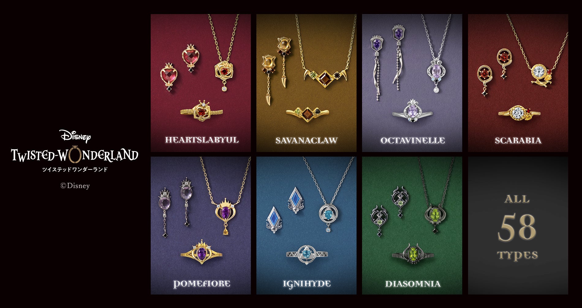 名門魔法士養成学校「ナイトレイブンカレッジ」に通う寮生22人をイメージしたネックレス・リングと、7寮をイメージしたピアス・イヤリングは『ディズニー ツイステッドワンダーランド』の世界観をイメージし、細部までこだわった特別感溢れるジュエリーです。