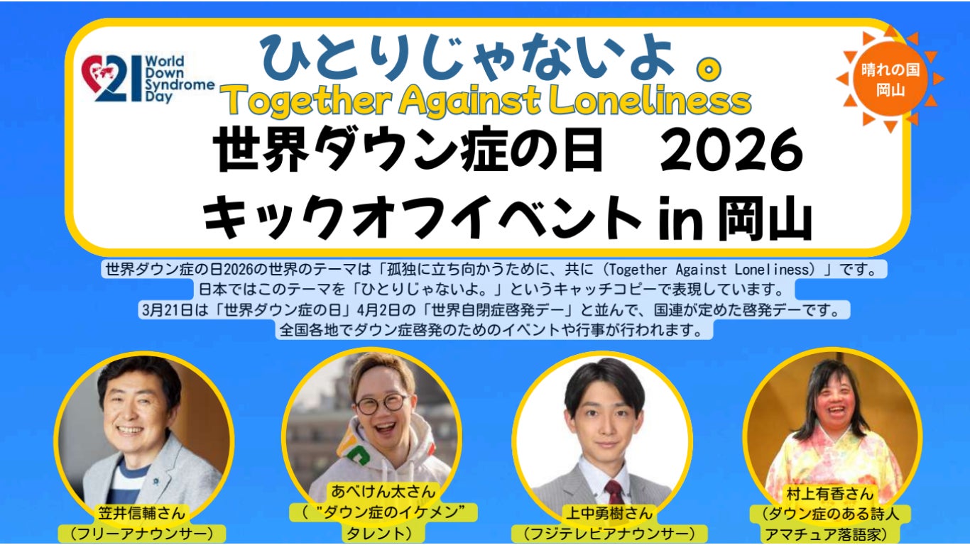 公益財団法人日本ダウン症協会(本部:東京都豊島区、代表理事:玉井 浩、以下「JDS」)は、3月21日の「世界ダウン症の日」に向け、日本の2026年キャッチコピーとして「ひとりじゃないよ。」(Together Against Loneliness)を軸とした特設サイトを公開いたしました。本サイトを通じて、啓発ポスターの無料配布受付や、岡山で開催される「キックオフイベント」をはじめとする各地のイベントやライトアップ情報、チャリティーなど、ダウン症のある人とその家族、そして社会を繋ぐさまざまな活動を発信してまいります。
