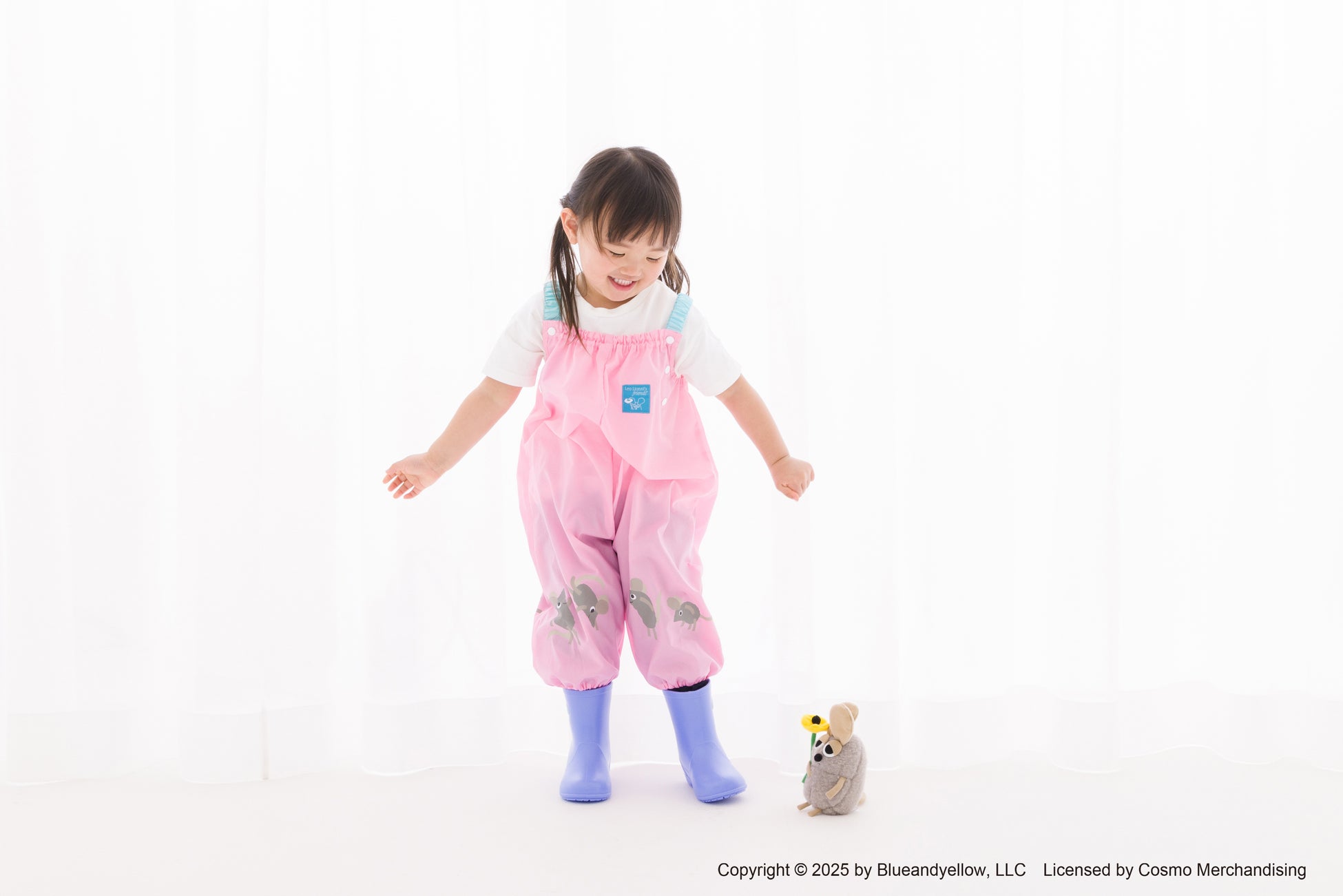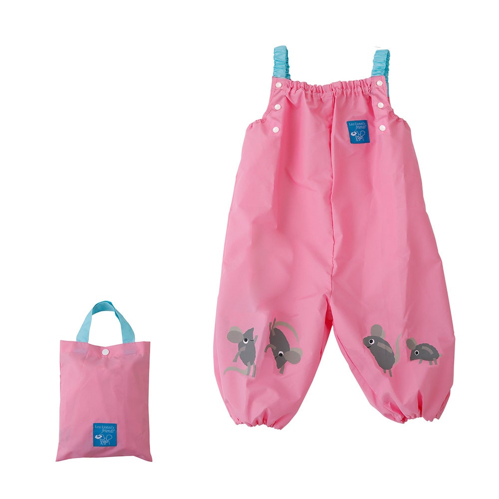 野ねずみたちがプリントされたプレイウェア(お砂場着)。前面だけでなく、背面にも隠れています。傘と同じはっ水をする生地を使用しているので、雨の日だけでなく、お砂場遊びなど服を汚したくない場面でも活躍してくれます。