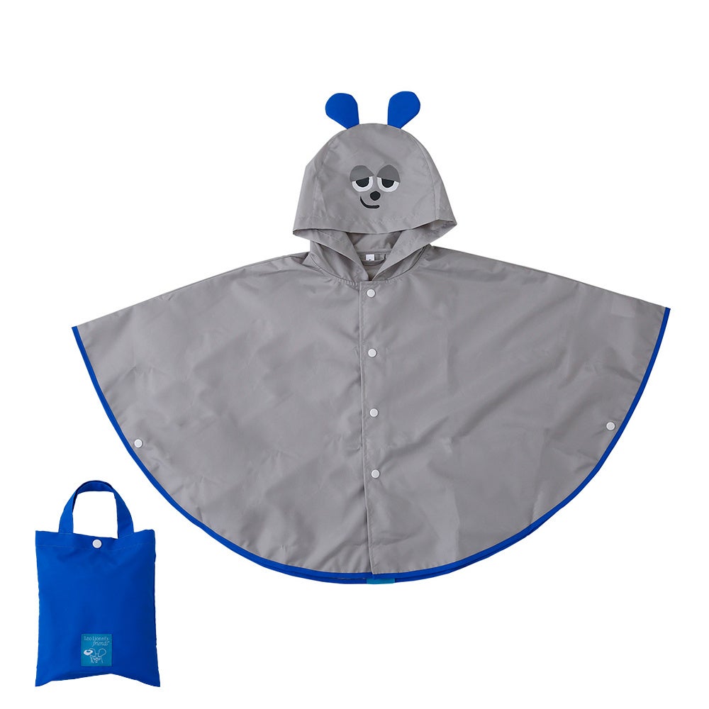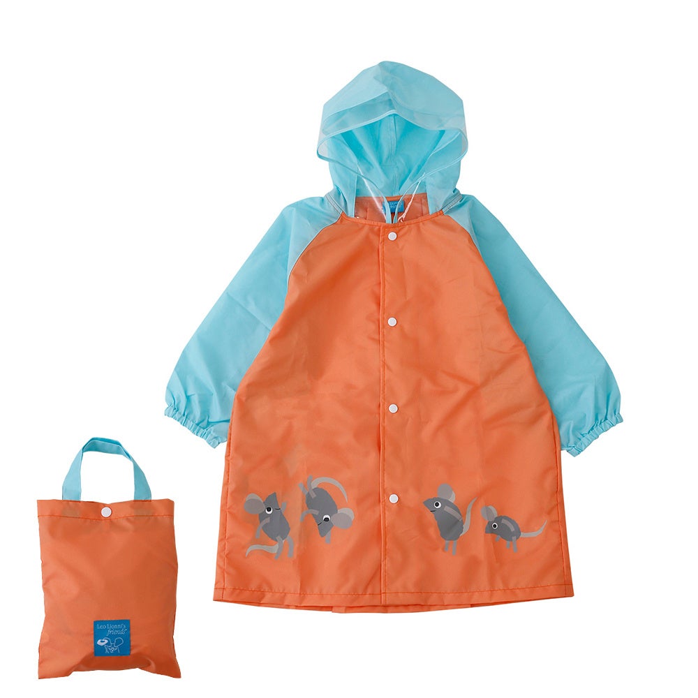野ねずみたちがプリントされたレインコート。前面だけでなく、背面にも隠れています。フードには前が見やすい透明窓、背面にはタックの部分に反射素材を使用するなど、雨の日の安全も意識した仕様になっています。持ち運びに便利なミニトート付きです。
