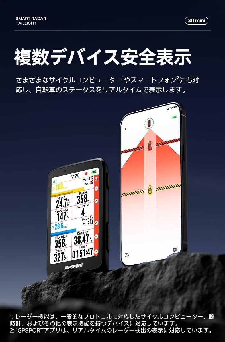 こうした背景のもと、iGPSPORTは従来のテールライト機能に加えてレーダー機能を搭載した「SR mini」をリリースいたしました。最大160m後方からの車両を検知し、接近状況をリアルタイムでサイクルコンピューターやアプリに表示します。さらに急ブレーキ時には高輝度で点灯して後方へ警告を発し、追突事故のリスクを大幅に軽減します。