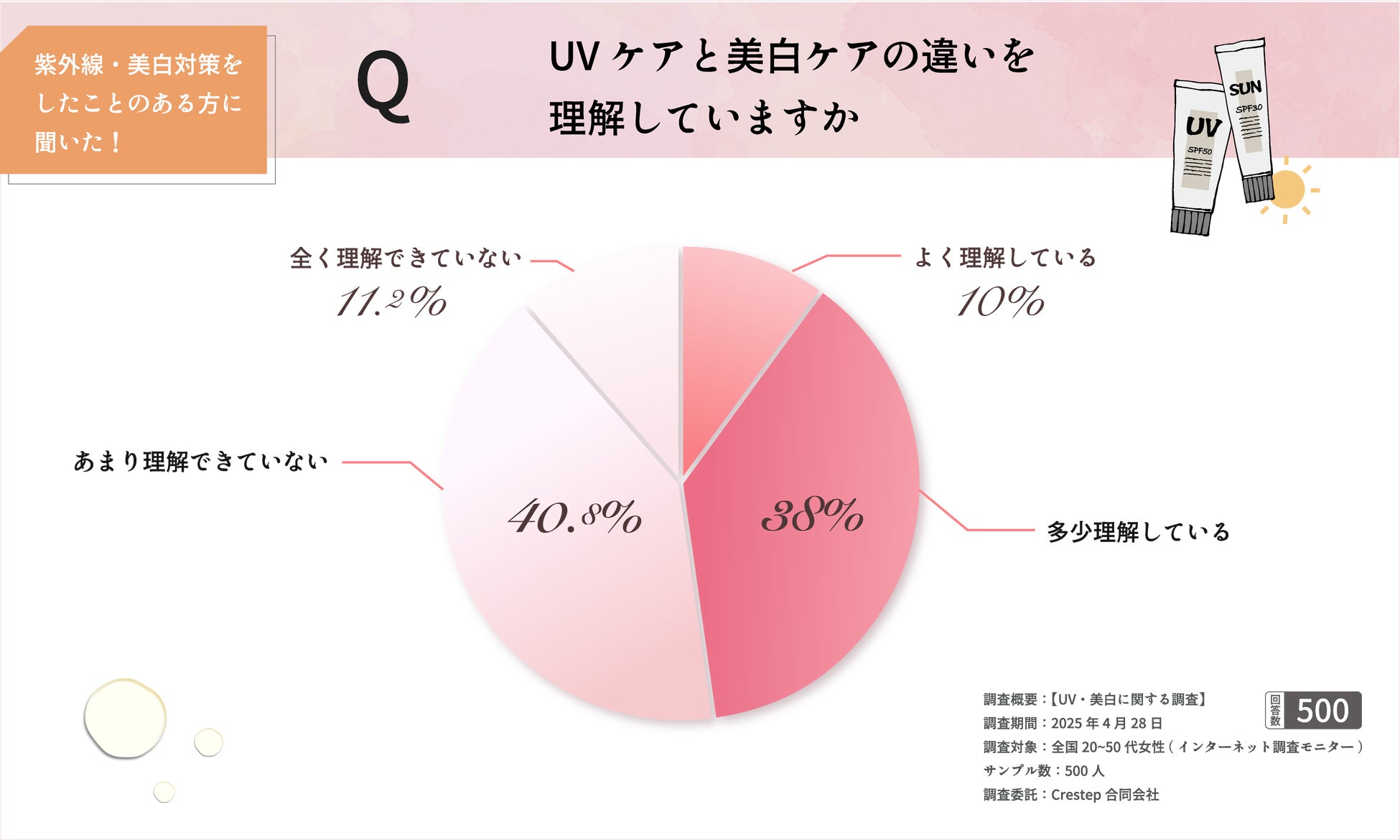 「UVケアと美白ケアの違いを理解していますか?」との問いに、「よく理解している」と答えたのはわずか10%。「多少理解している」(38%)を含めても、理解度があいまいな人が過半数を占め、「あまり理解できていない」(40.8%)、「全く理解できていない」(11.2%)を合わせると、理解不足が浮き彫りとなっています。