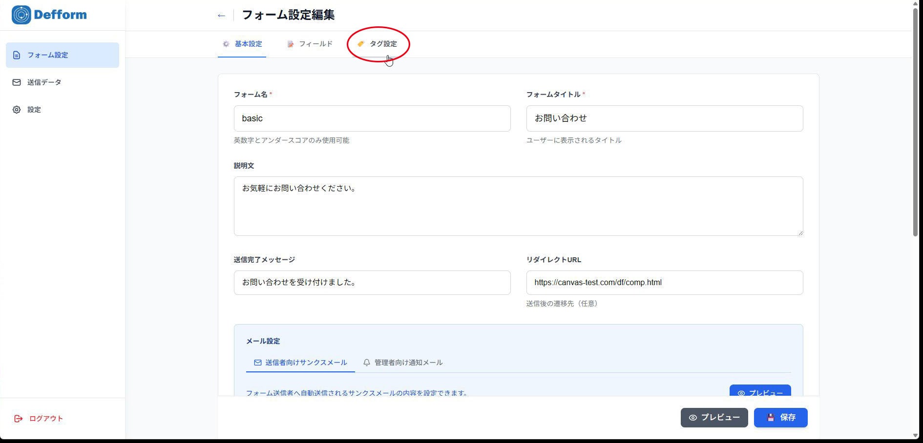 2.「フォーム設定編集」の画面から「タグ編集」画面へ移ります。