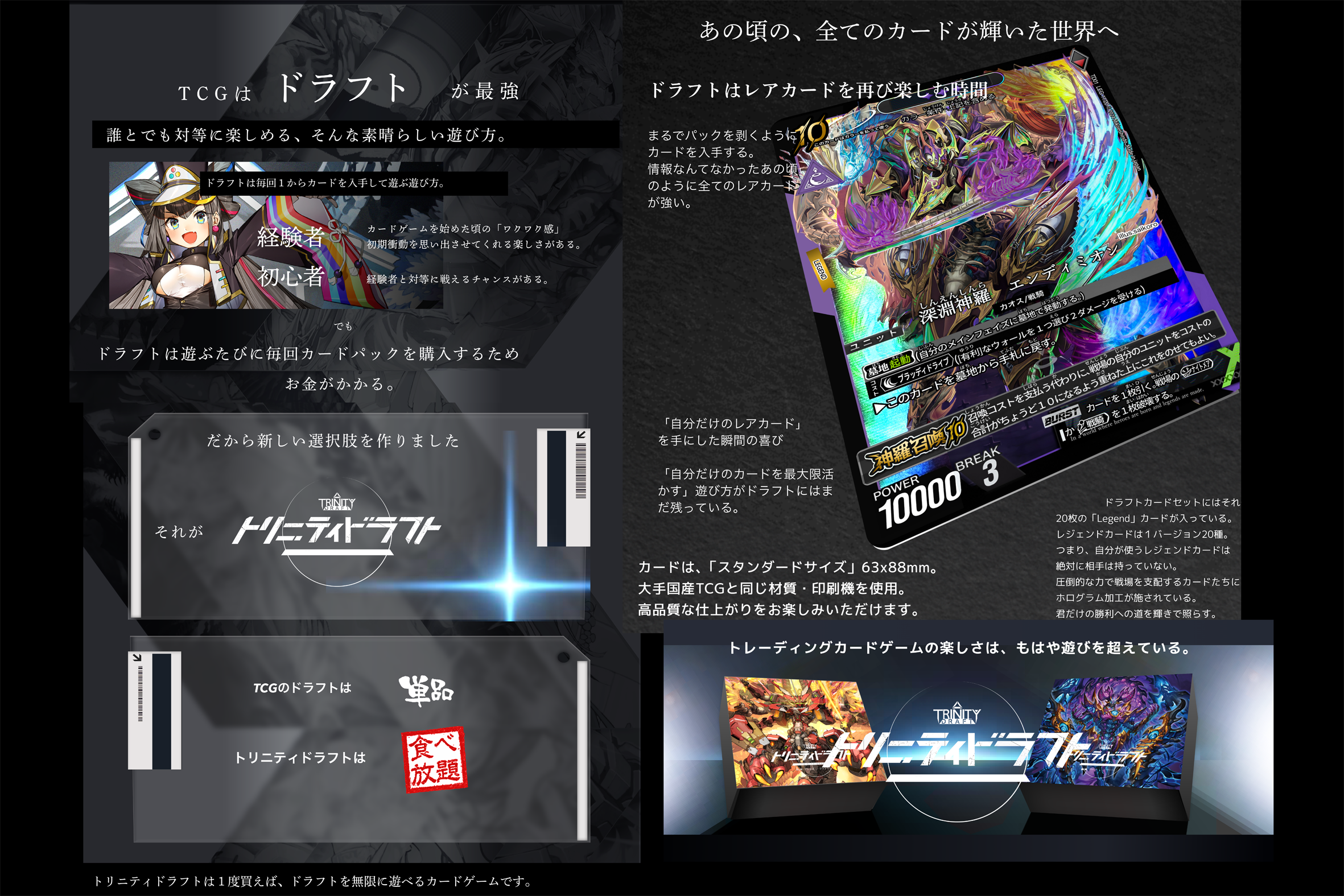 「トリニティドラフト」のクラウドファンディングの成功を記念して、支援者様に向けた特別なプロモーションカードの配布が決定しました。また、ストレッチゴールの設定も現在検討しております。