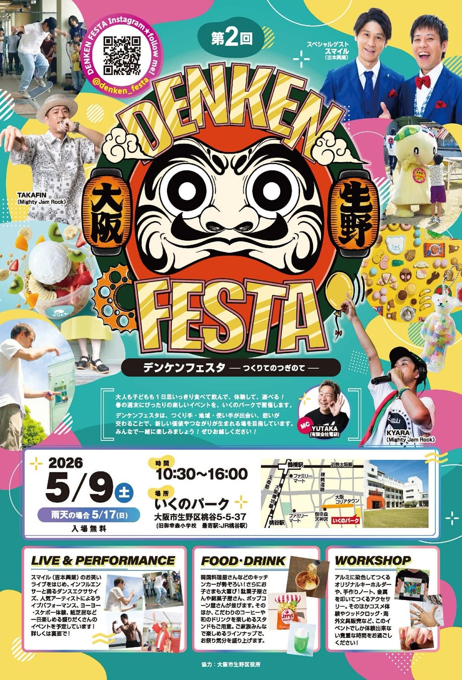 大阪市生野区のアルマイト加工会社・有限会社電研(DENKEN)は、2026年5月9日、体験型地域イベント「DENKEN FESTA」を開催する。初開催となった前回は来場者数2025人を記録。第2回となる今回は、27ブースに加え、吉本興業のお笑いライブや音楽ライブなど無料で楽しめるコンテンツと、体験型ワークショップを融合させた町工場発の地域フェスとして進化する。母の日直前の開催となり、ものづくり体験を通じてプレゼントを制作できる点も特徴だ。