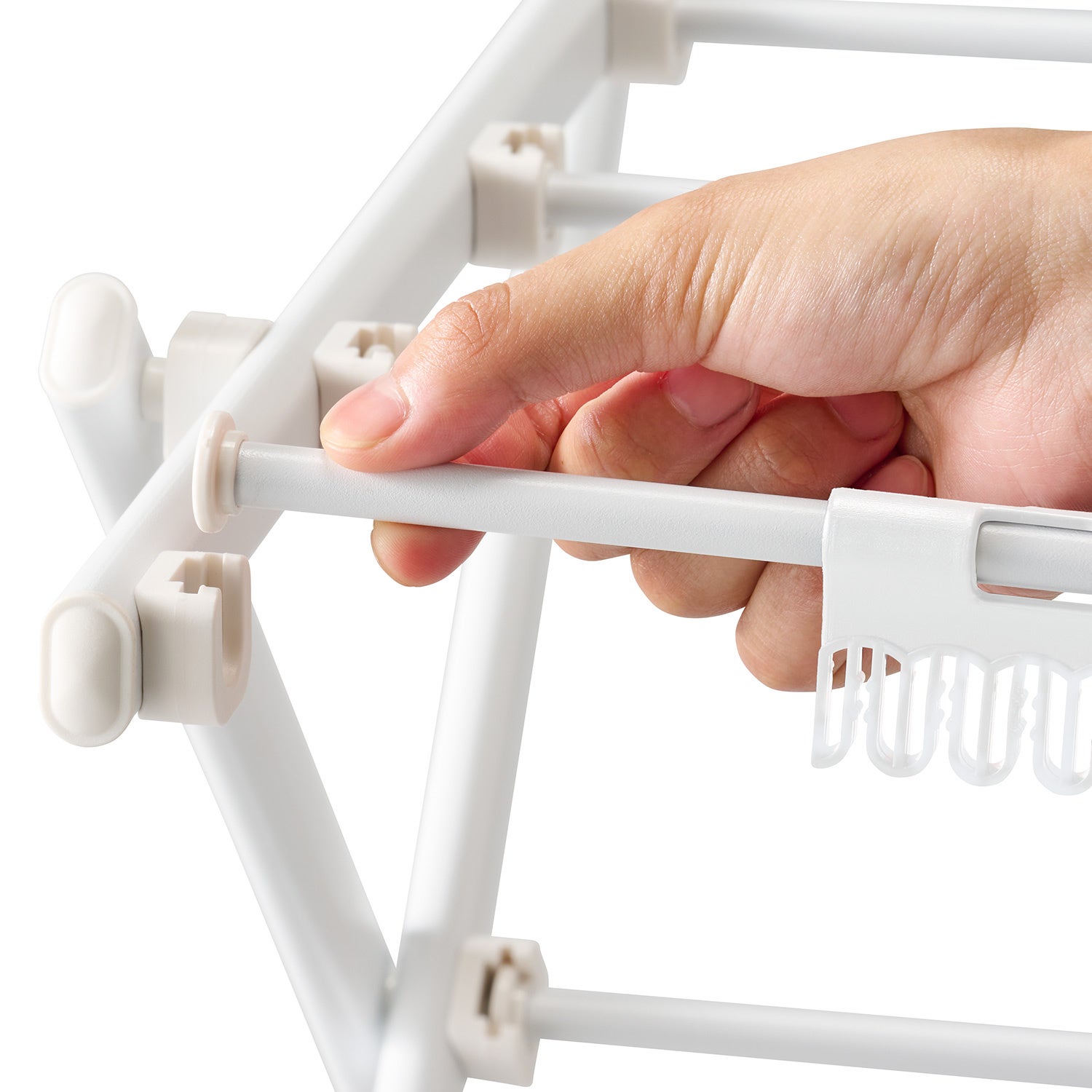 一度組み立てれば、たたんだ状態からシュパッと上に引き上げ、固定パーツにはめ込むだけでいつでも干せます。
