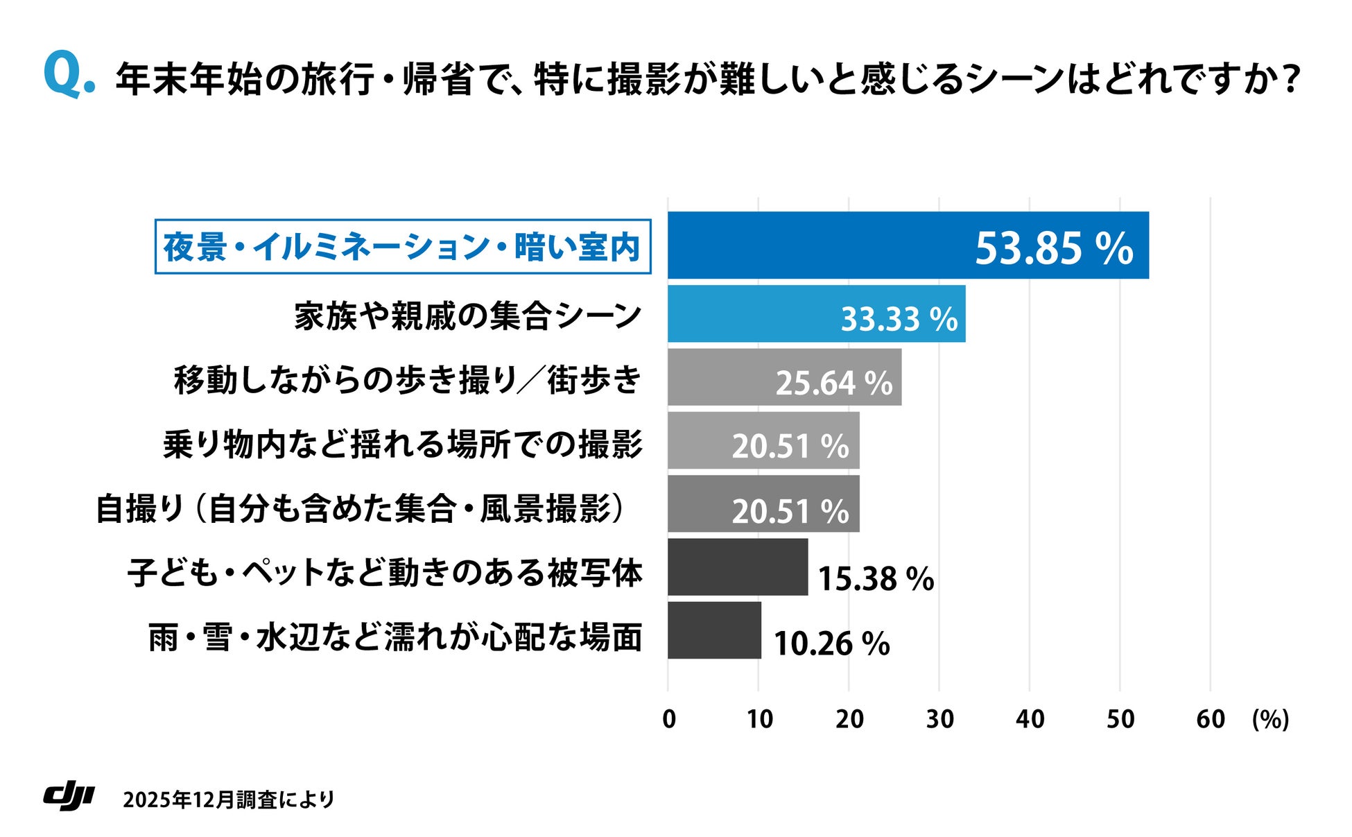 撮影が難しいシーンは「夜景・イルミネーション・暗い室内」が最多の53.85%