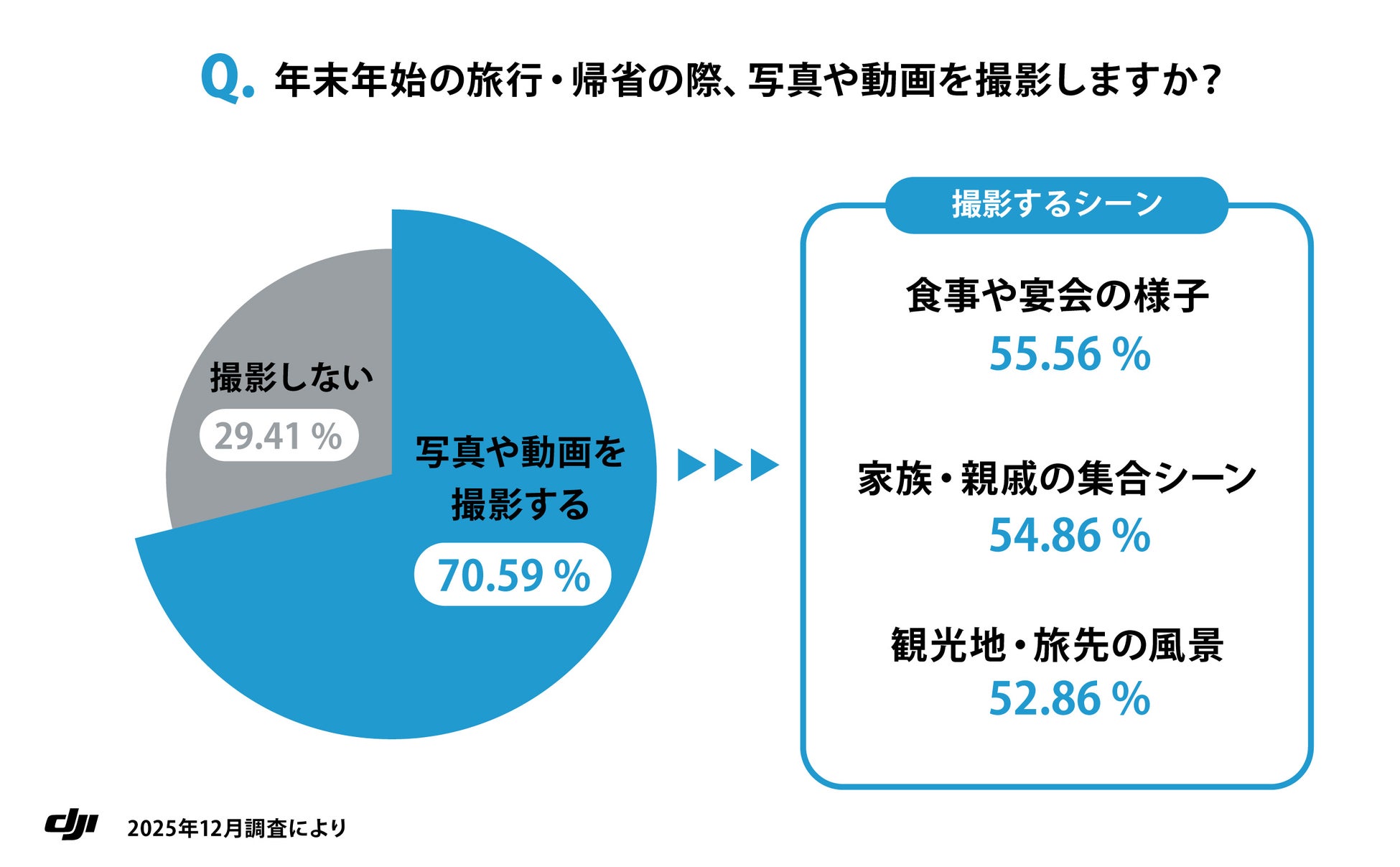 民生用ドローンとクリエイティブカメラ技術のグローバルリーダーであるDJIは、全国の20〜69歳の男女600名を対象に、「年末年始の旅行・帰省における動画撮影」に関するアンケート調査を実施しました。