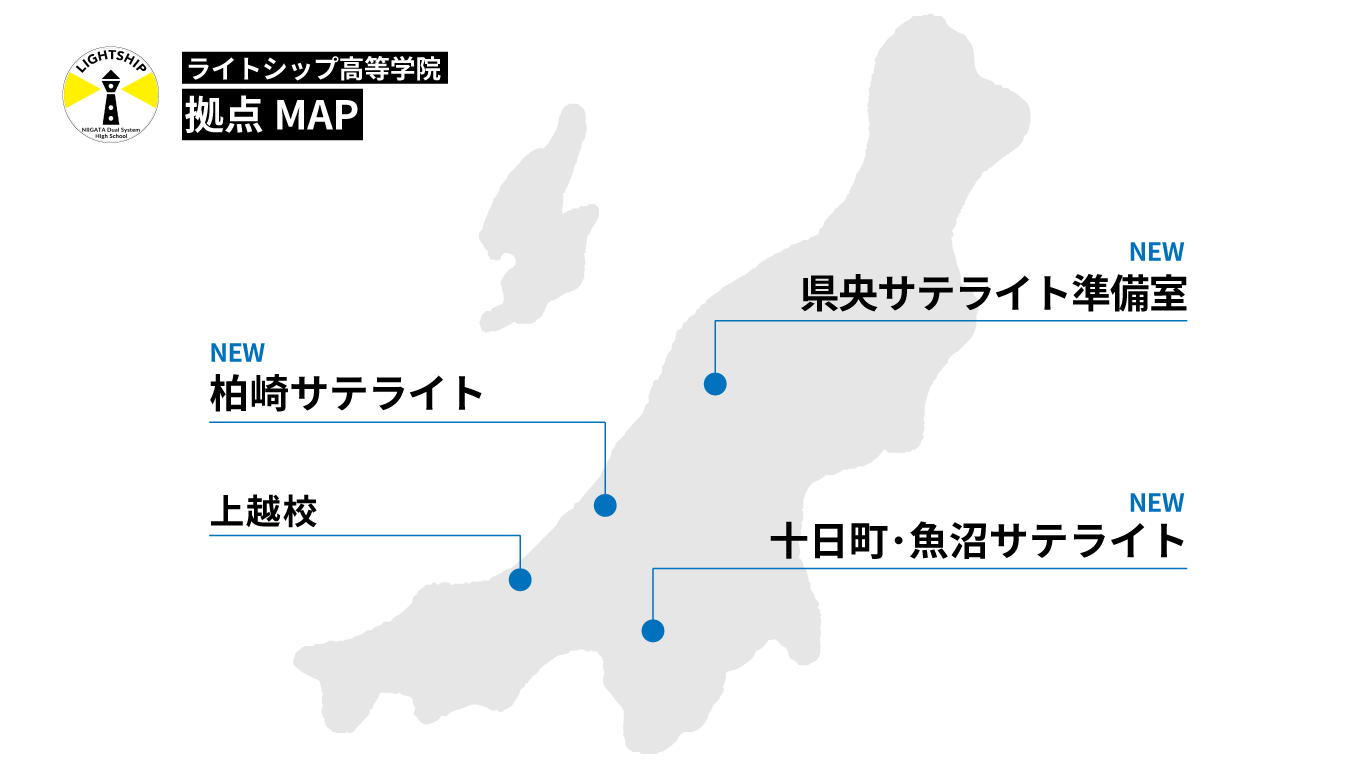 ライトシップ高等学院は2025年4月に開校し、これまで上越エリアを中心に教育活動を行ってきました。今回の拡大では、柏崎地域および十日町・魚沼地域に新たにサテライト拠点を設置し、県内の複数地域で教育支援を提供する体制を整えます。