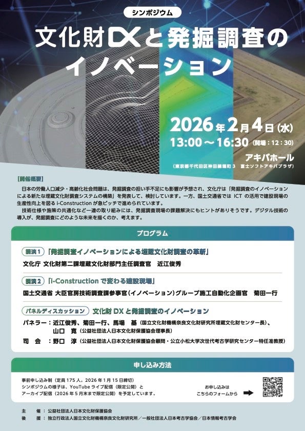 文化財の保存と活用におけるデジタル技術導入を、官民共同で推進する公益社団法人日本文化財保護協会は、「発掘調査のイノベーション」を掲げる文化庁、「i-Construction」を強力に推進する国土交通省から、担当官を招聘し、民間事業団体としてのビジョンも交えた、シンポジウムを開催します。