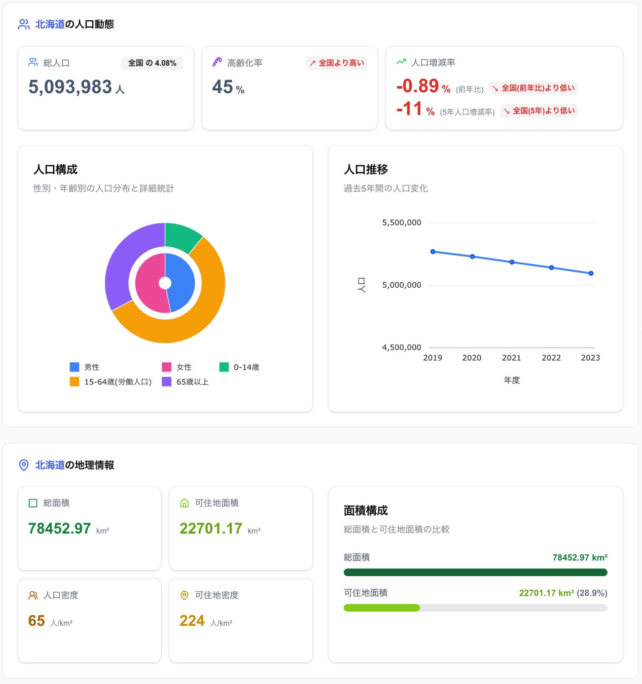 自治体の物理的な特性を理解し、提案の説得力を高めます。人口密度が高い自治体には都市機能の効率化を、可住地面積が広い自治体には地域活性化を目的とした提案を行うなど、地理的条件を踏まえた具体的なソリューションを提示できます。