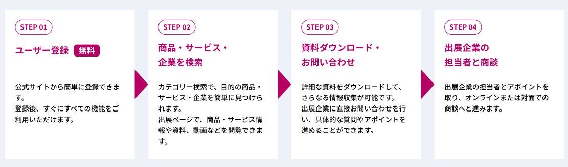 無料のユーザー登録をすることで、商品・サービス・出展企業の詳細情報の閲覧、資料のダウンロード、出展企業へのお問い合わせが可能になります。