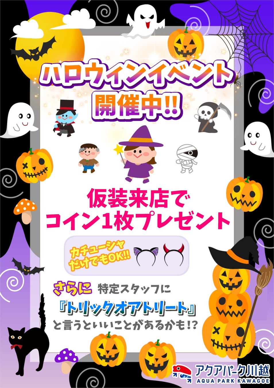 10月1日〜31日までの期間中、アクアパーク川越ではハロウィンイベントも開催中。以下のような楽しい企画を多数ご用意しています。