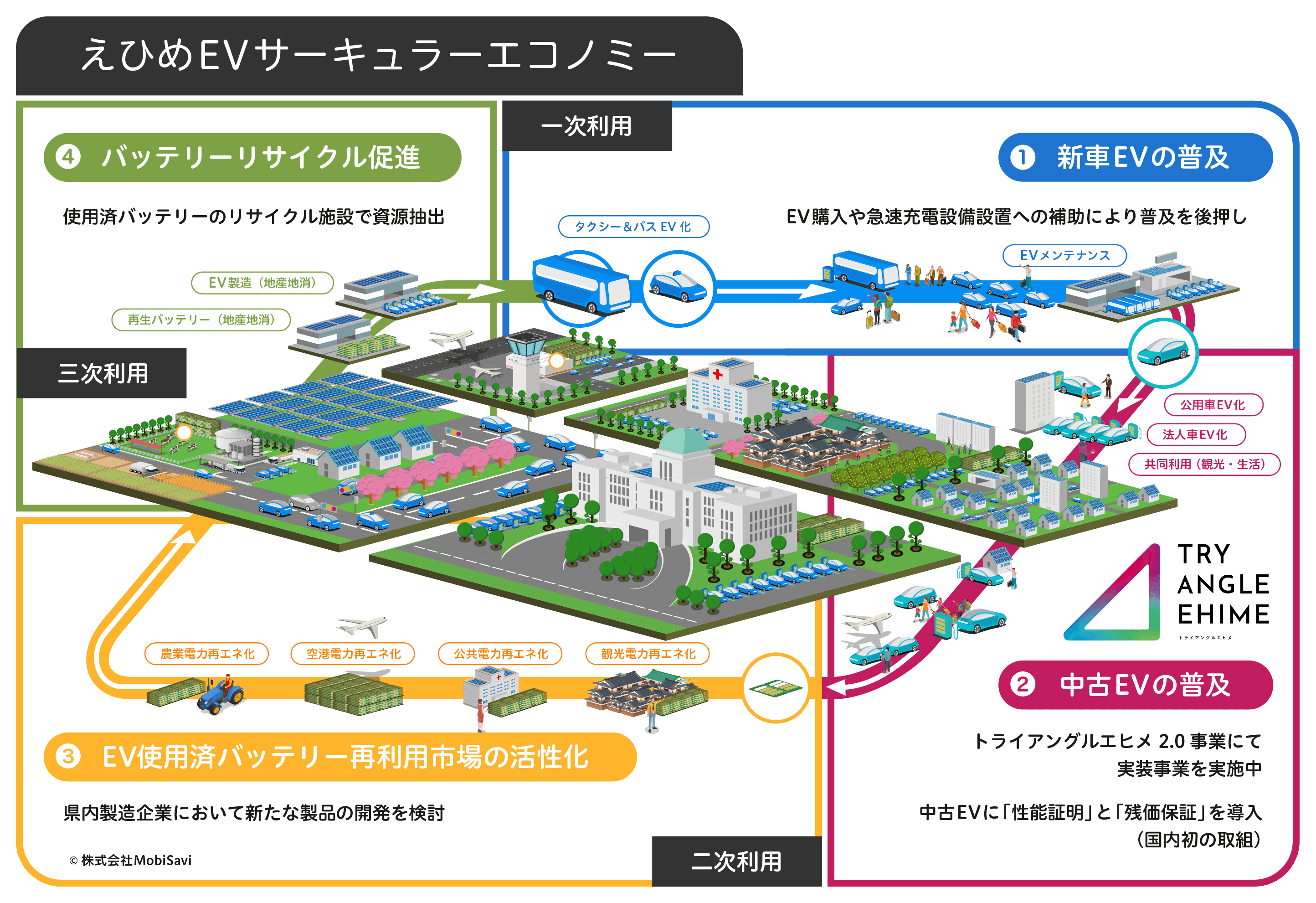 MobiSaviは、これまで愛媛日産自動車株式会社などと連携し、EVバッテリーの性能可視化と残価保証を組み合わせたリユースEV流通モデルの構築を、愛媛県のデジタル実装加速化プロジェクト「トライアングルエヒメ2.0」に採択され、推進しています。
