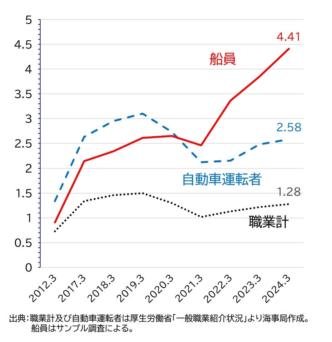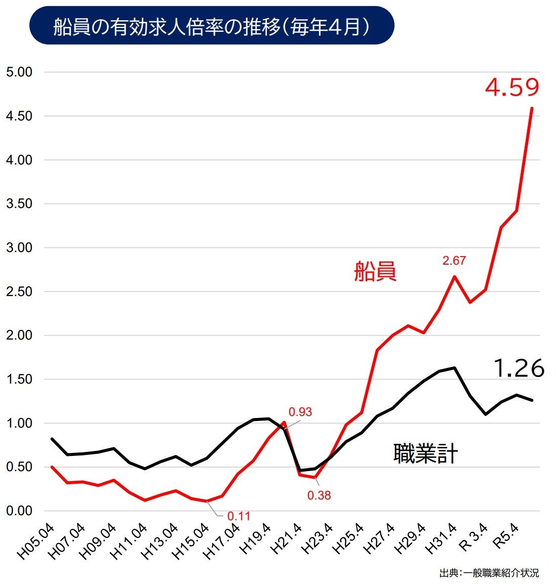 船員新規求人数は増加傾向である一方、新規求職数は減少傾向にあり、同時期の陸上労働者の有効求人倍率は約1.3倍であるのに対し、有効求人倍率は4倍を超える倍率となっている