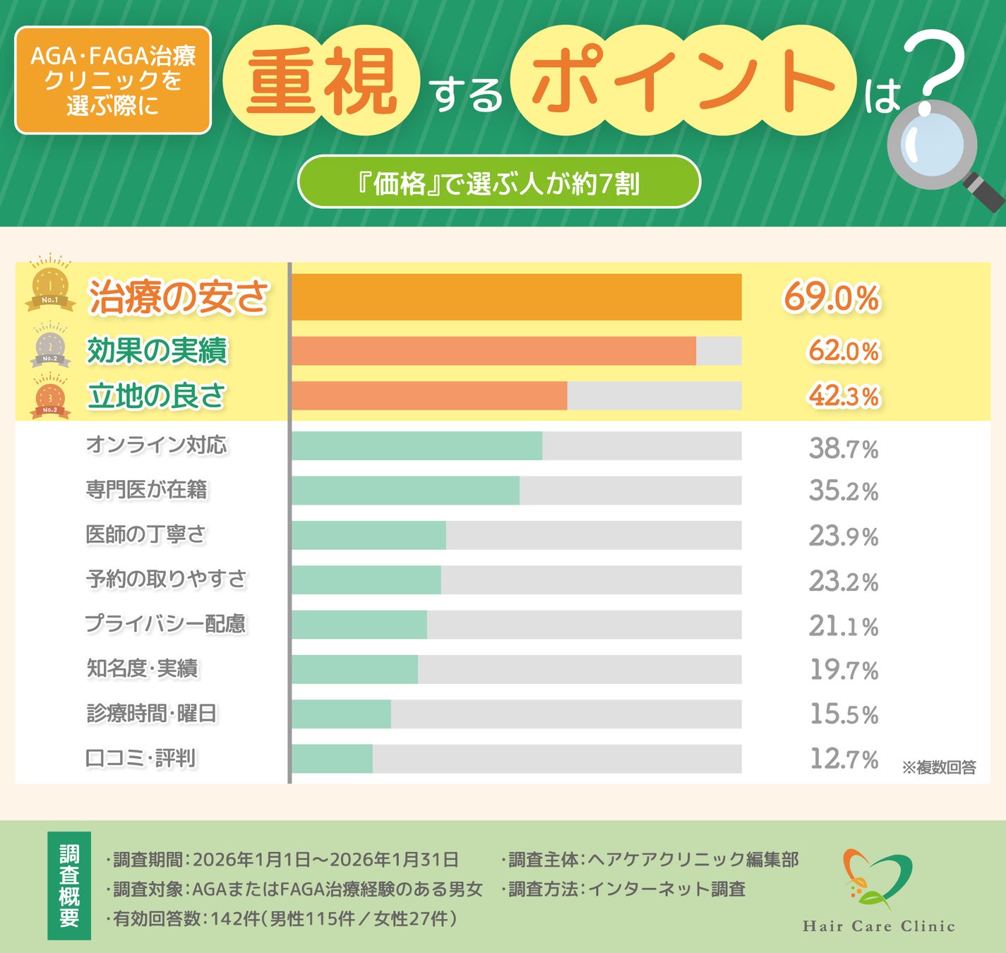 本調査結果が、これからAGA・FAGA治療を検討する方にとって、自分に合った治療方法やクリニックを選ぶための客観的な判断材料となれば幸いです。