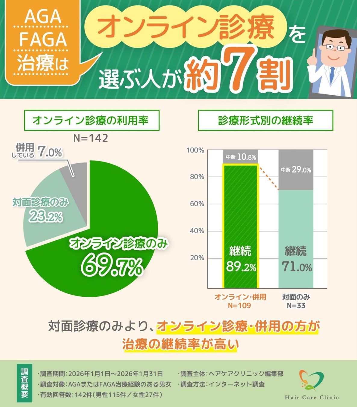 【2026年調査】AGA・FAGA治療経験者の約8割がオンライン診療を利用|ヘアケアクリニック調査
