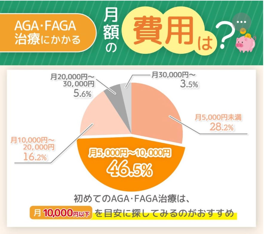 「月5,000円未満」の回答も28.2%と多く、約7割の人が月額10,000円未満でAGA・FAGA治療をしていることが分かります(74.7%)。
