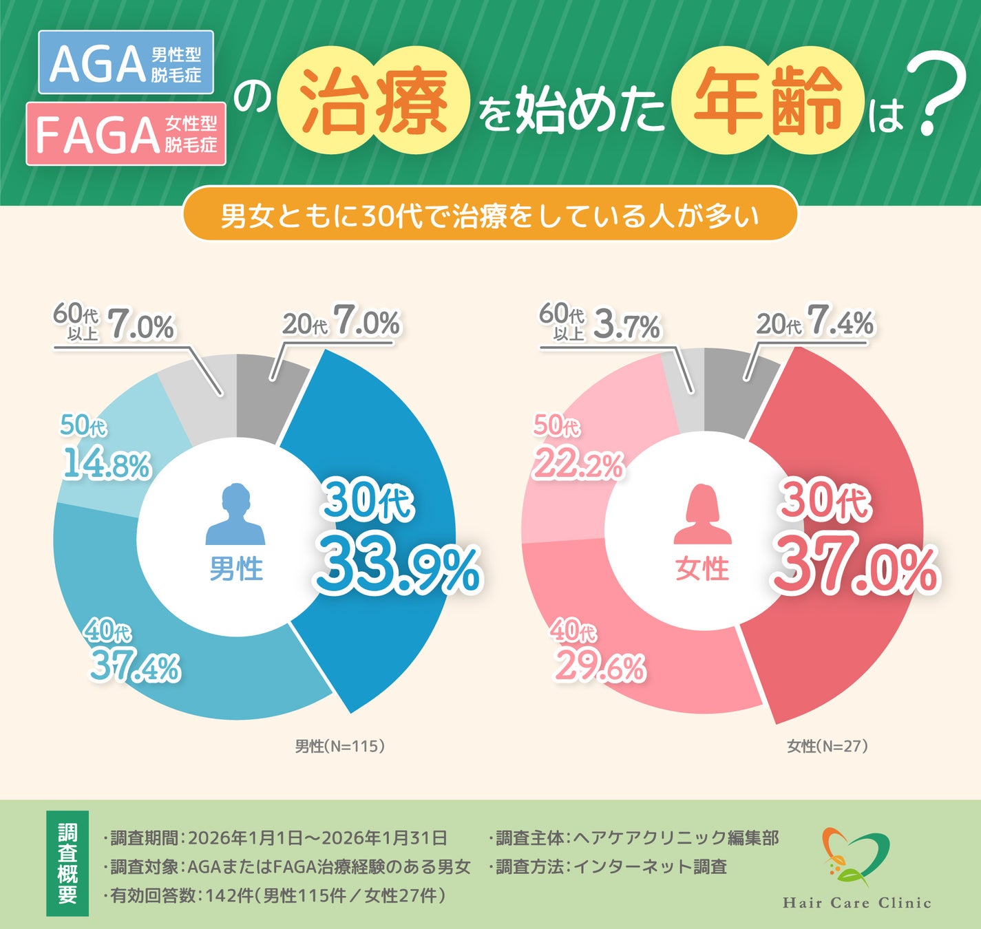 本レポートは、実際にAGAまたはFAGA治療を経験した男女142名を対象に実施したアンケート調査の結果をもとに、治療を始めたきっかけ、治療前に感じていた不安、クリニック選びで重視されたポイント、治療内容やオンライン診療の利用状況、そして治療の継続率や中断理由に至るまで、AGA・FAGA治療の「実態」を多角的に分析したものです。