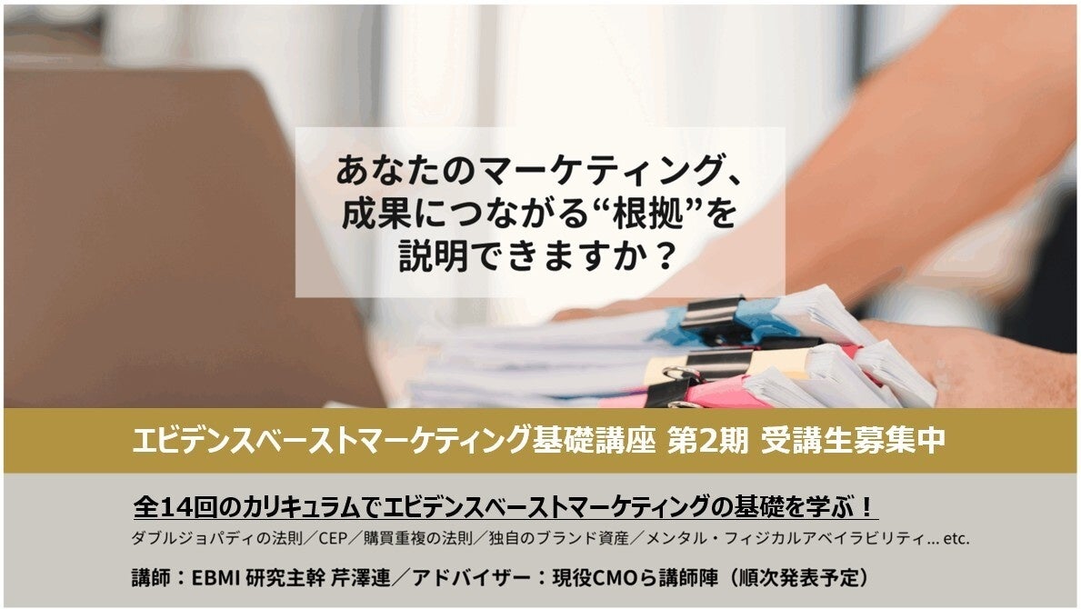 一般社団法人日本エビデンスベーストマーケティング研究機構(所在地:東京都中野区、代表理事:木田 浩理、以下 EBMI)は、エビデンスベーストマーケティング(EBM)の基礎を体系的に学ぶ「エビデンスベーストマーケティング(EBM)基礎講座」の第2期を2026年6月より開講します。