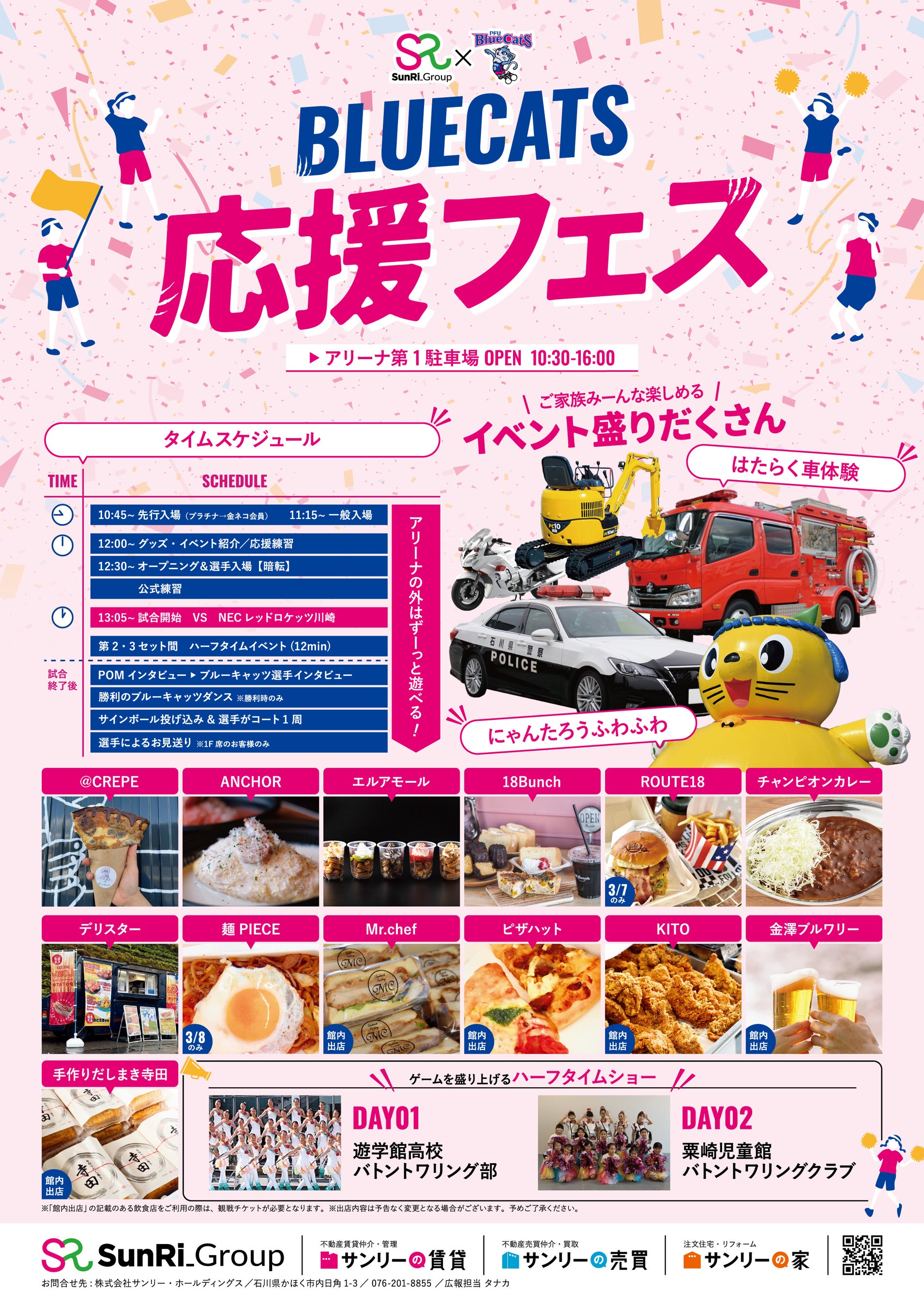 当日は白熱の試合観戦に加え、ゲームを盛り上げるハーフタイムショーや石川県のグルメが集結するキッチンカーなど、さまざまなイベントを実施します。ハーフタイムショーでは、1日目に遊学館高校バトントワリング部、2日目には粟崎児童館バトントワリングクラブの皆さんが出演し、華麗なパフォーマンスで会場を盛り上げます。