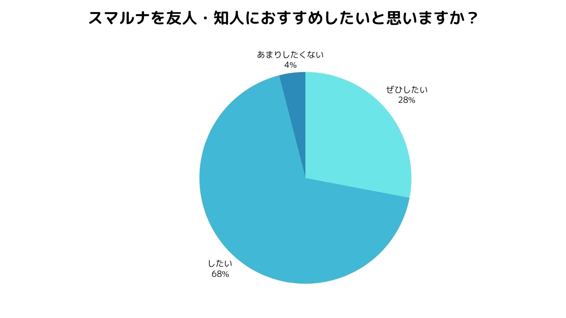 「スマルナを友人・知人にすすめたいと思いますか?」という質問に対して、「ぜひすすめたい」(28%)、「すすめたい」(68%)と回答した方は全体の96%にのぼり、非常に高い推奨意向が示されました。