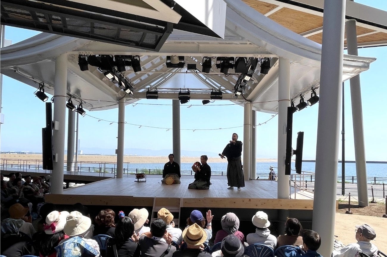 また、ニューヨークからの参加者は『高砂』をテーマに、国境や文化を超えて平和と共生のメッセージを動画で発信しました。また、万博会場では高砂市から都倉達殊市長にご臨席いただき、『高砂』のルーツをご紹介いただくとともに、自らもステージで謡を披露し、能楽師や会場の皆さまと共に『高砂』を謡う場面もありました。世界と地域それぞれから、文化の魅力と平和への想いを届ける場となりました。この会場は、大阪湾の西の海を望む場所にあり、古くから多様な文化や人々が行き交った地でもあります。その海は、謡曲『高砂』に詠まれる播磨の高砂神社から大阪住之江の住吉大社までの船路を象徴しています。