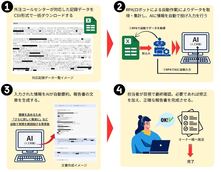こうした課題を解決するため、ハタスでは外注コールセンター業務の対応記録データを一括でCSV形式にダウンロードし、それを自動処理する仕組みを構築しました。この仕組みにより、報告書作成作業の大部分が自動化され、属人的な手作業に依存しない体制を実現。また、報告内容の標準化が図られ、人による記載漏れや誤記載のリスクも低減しています。さらに、RPAが定型処理、AIが文章生成という役割分担を行うことで、それぞれの技術の強みを引き出し、相乗効果による効率化を達成しました。
