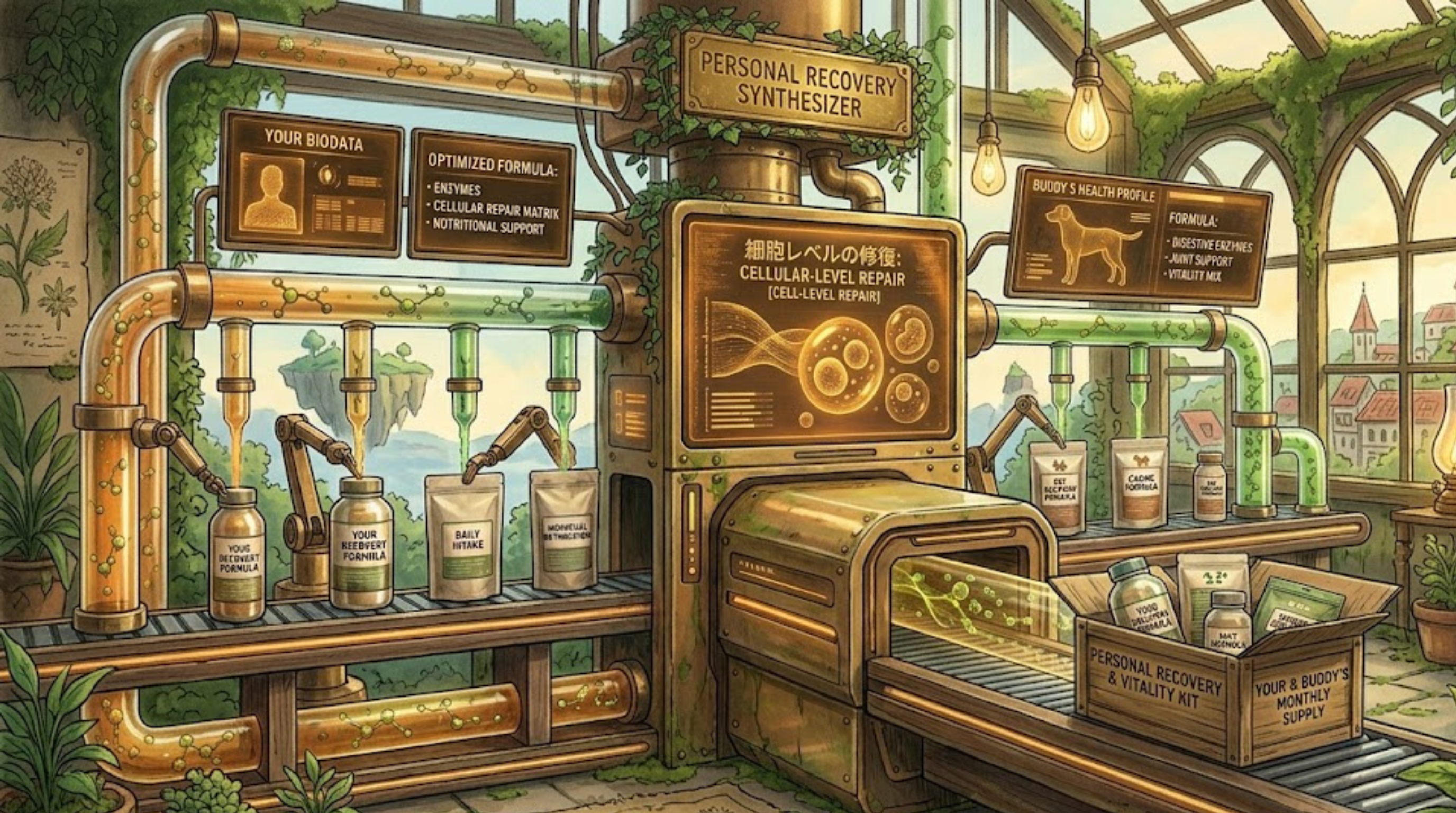 そのデータに基づき、酵素をはじめとした「今日の世界でただ一つの、あなたとペットのための完全オーダーメイドのリカバリーフード&ドリンク」が毎月自宅に届くシステムを構築します。