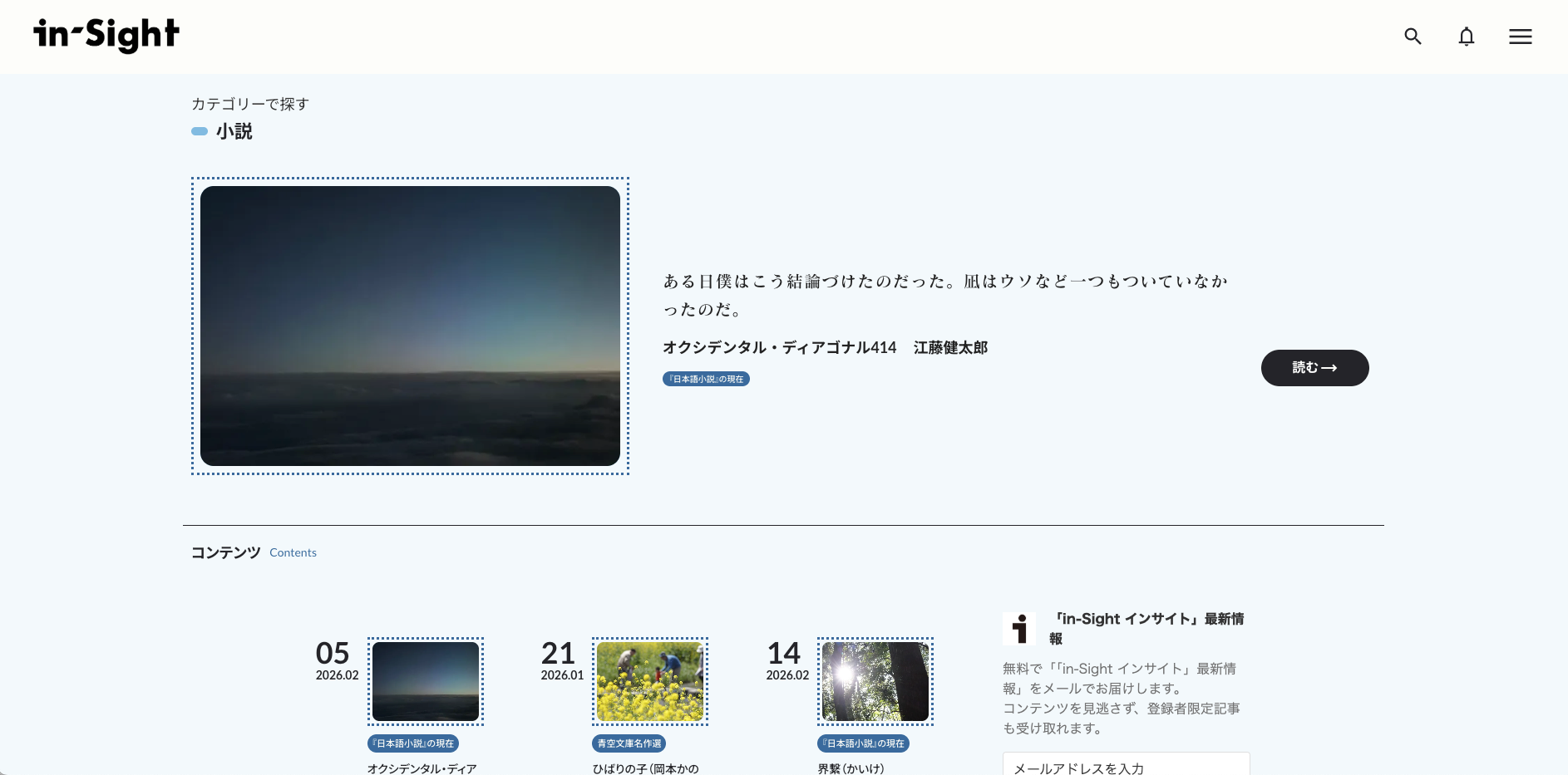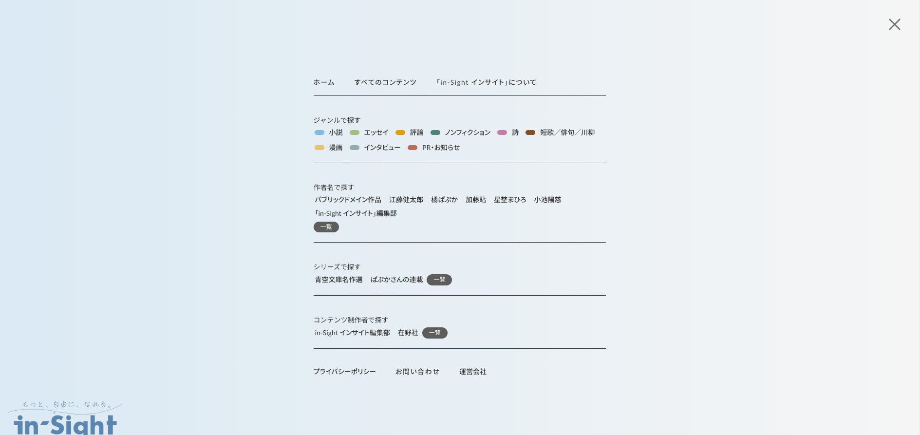 「in-Sight インサイト」は、無料で購読できるジャンルレス/クロスメディアな創作Webマガジンです。