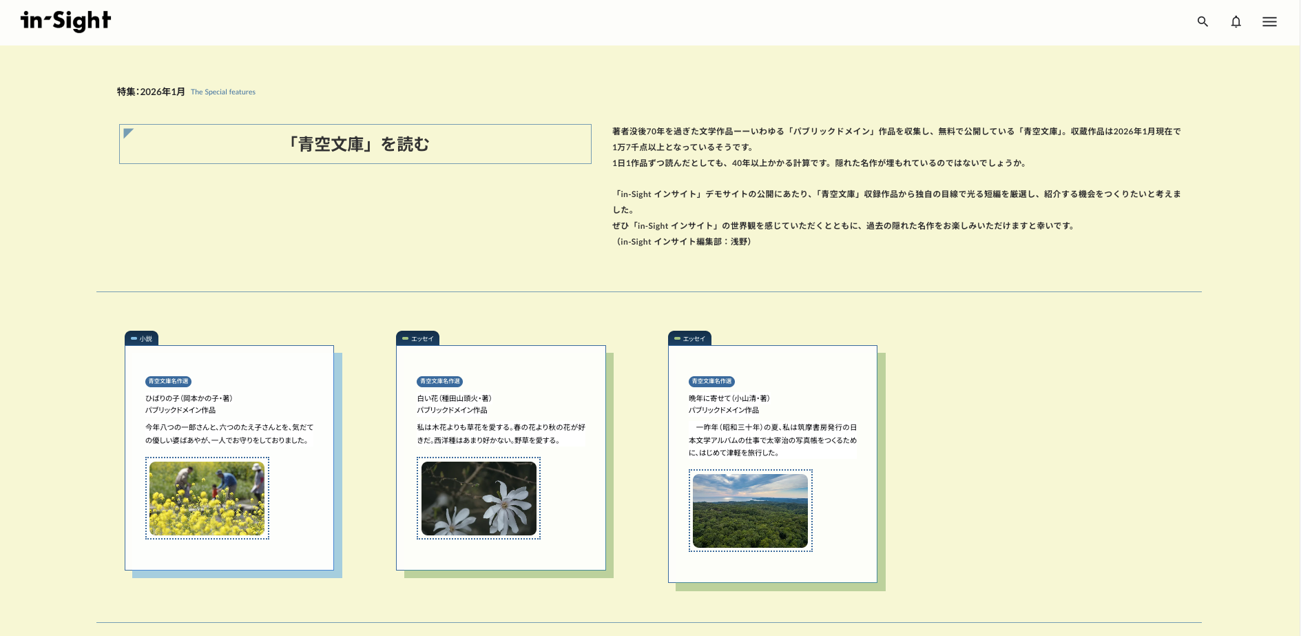 各方面で活躍中の小説家、文筆家が「in-Sight インサイト」の理念と取り組みに共感くださり、すばらしい力作が揃いました。ここでは公開の準備が整った作品をご紹介いたします。