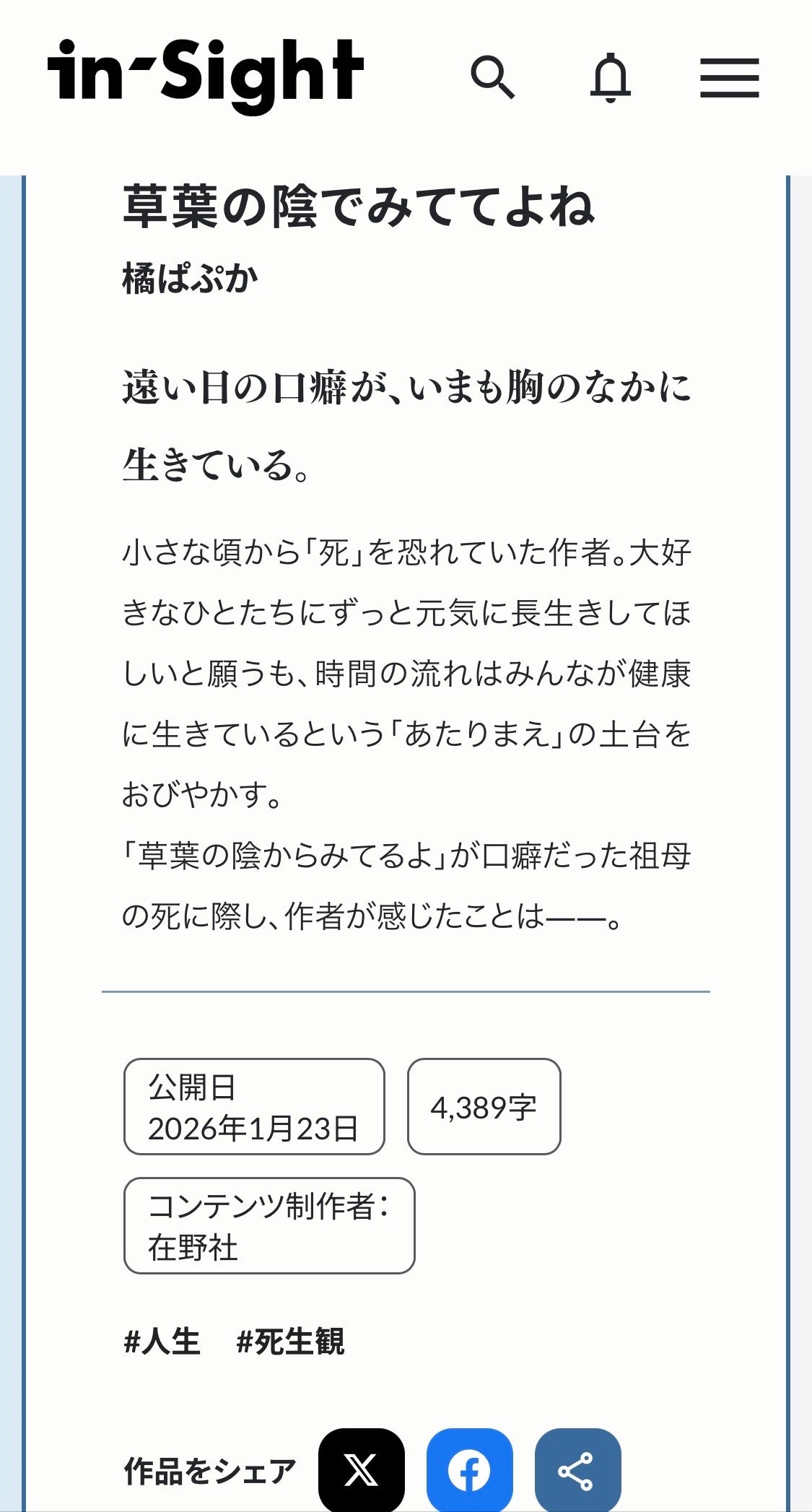 2026年2月16日、合同会社在野社(本社:静岡県沼津市高沢町1-9-1110、代表・編集責任者:浅野葛)は、ジャンルレスな創作Webマガジン「in-Sight インサイト」(https://in-sight.zaiyasha.jp)をオープンします。