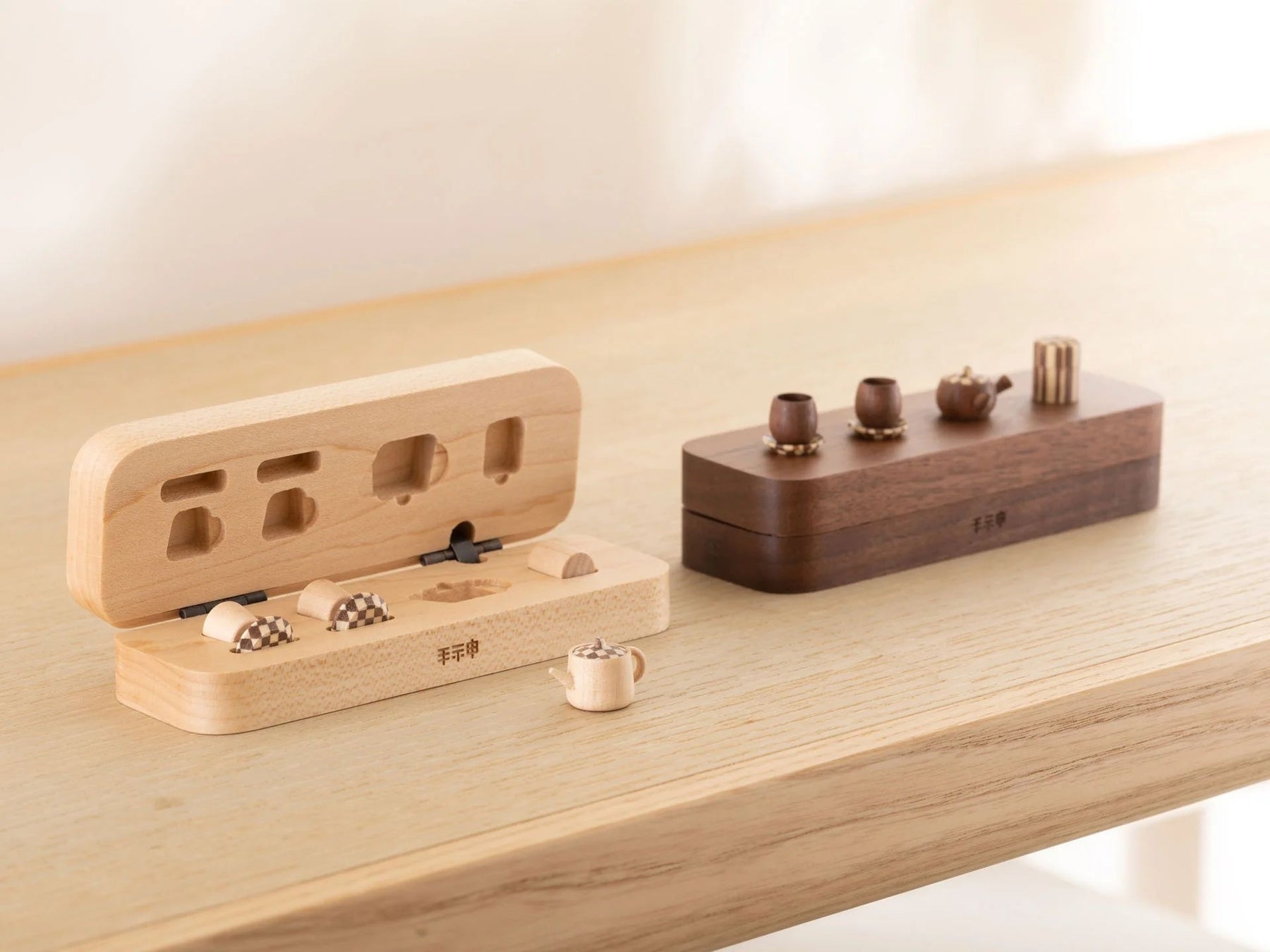 事前の市場調査とは異なる反応で、「全体的に木を使った商品がとても良い」「細かい手作業が感じられる豆茶器が魅力的」というお声をいただき、豆和茶器台箱の楓と胡桃とくみきをご注文いただきました。