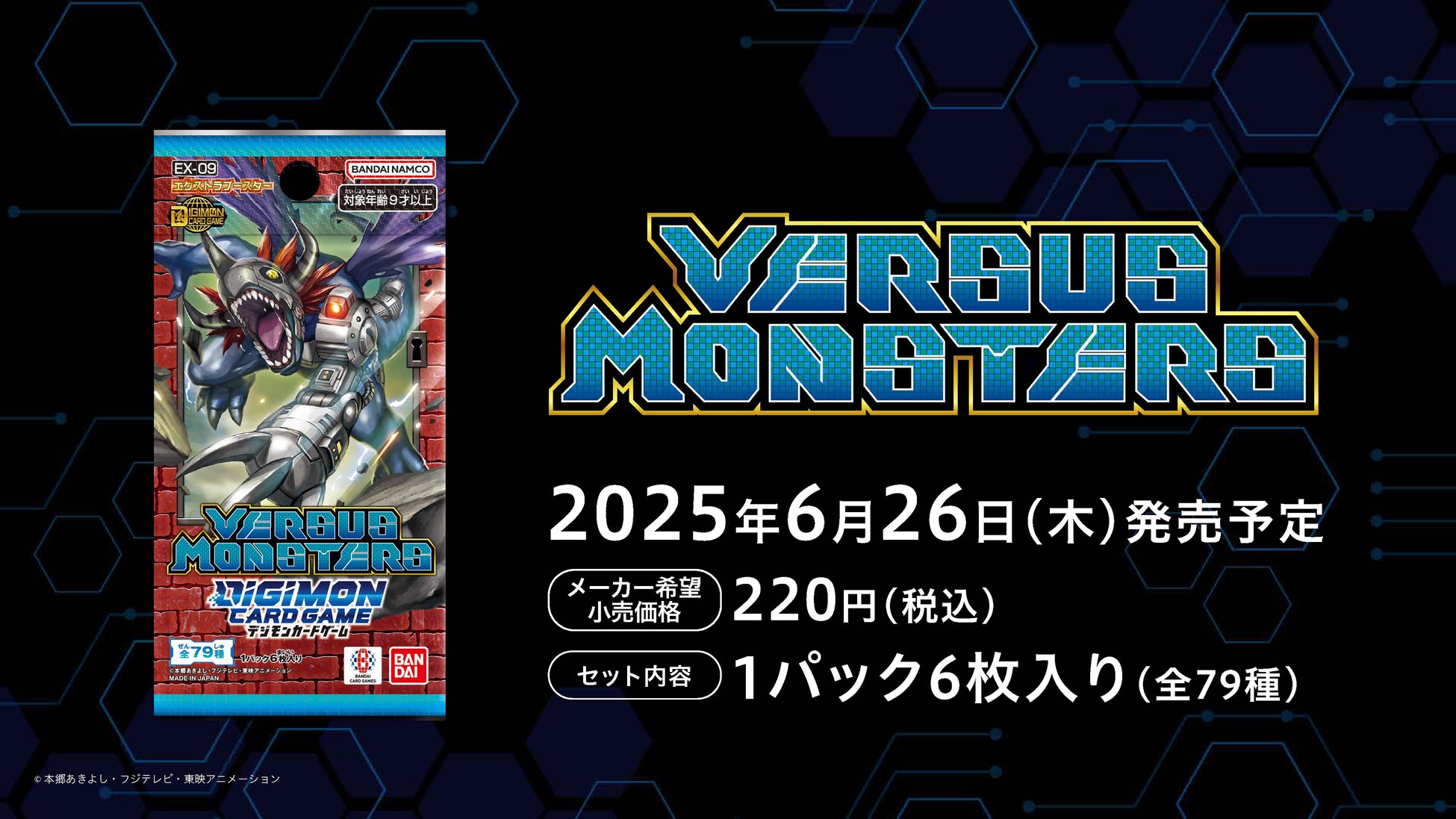 液晶玩具デジタルモンスターver.1~5に登場したデジモン達を収録したエクストラブースター第9弾「バーサスモンスターズ」が6月26日に発売。「ベタモン」や「エテモン」など根強い人気デジモンを多数収録しており、玩具ならではの遊びである食事やトレーニングもカードテキストで再現しています!