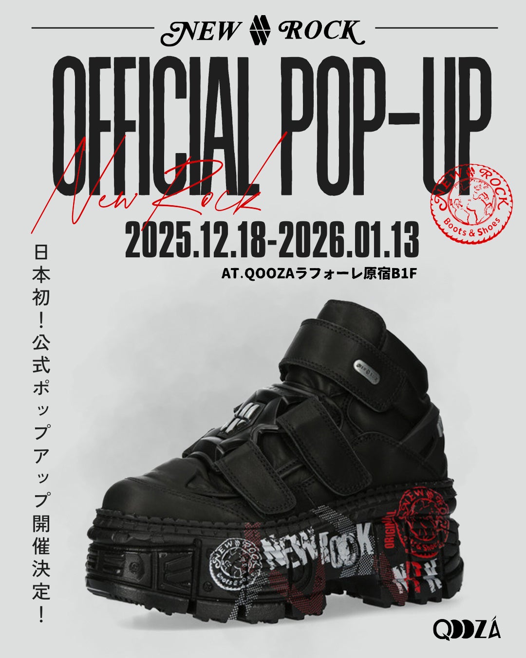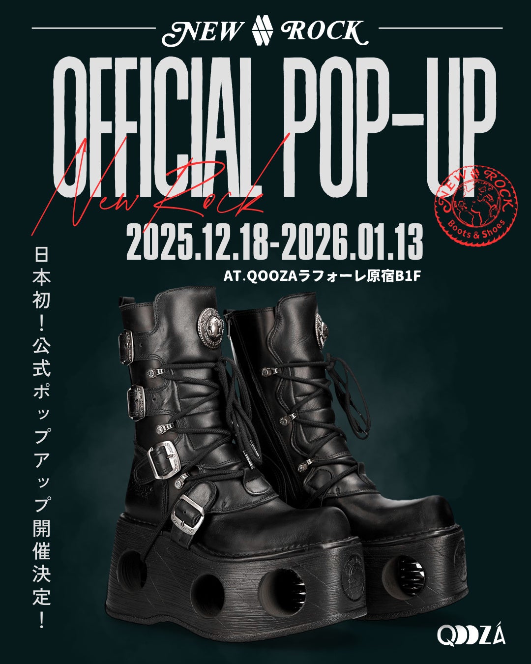 株式会社クリームは、ラフォーレ原宿B1.5Fのセレクトショップ「QOOZA」にて、スペイン発のシューズブランド「NEW ROCK(ニューロック)」のPOP UP STOREを2025年12月18日(木)~2026年1月13日(火)の期間限定で開催いたします。
