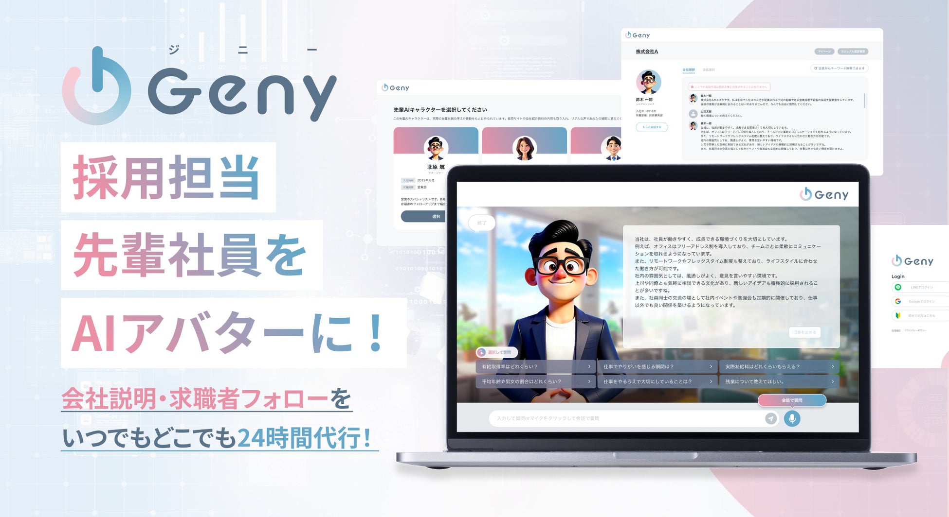 こうした背景を踏まえ、同社は限られた人的リソースでも求職者一人ひとりに丁寧な対応を提供し、職種ごとの理解を深めることを目的として、このほどKNT-CTホールディングス株式会社の来春入社内定者を対象に、AIアバター「Geny」の試験導入を決定しました。これにより内定者の入社前の不安を解消し、安心して入社いただくことが期待できます。