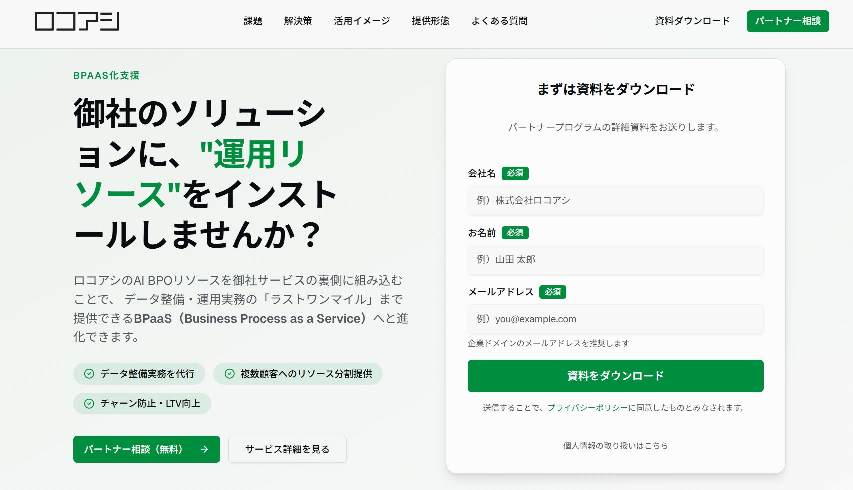 本プログラムは、御社のAIソリューション(ツール・コンサルティング・戦略設計)に、ロコアシのAI BPO(データ整備・運用実務・品質チェック)を組み合わせることで、顧客への提供形態を「BPaaS(Business Process as a Service)」へと進化させる支援を行います。ロコアシのリソースを御社サービスの裏側に組み込むことで、自社の固定コストを抑えながら「運用まで込みのプラン」を標準メニューとして提案できるようになります。