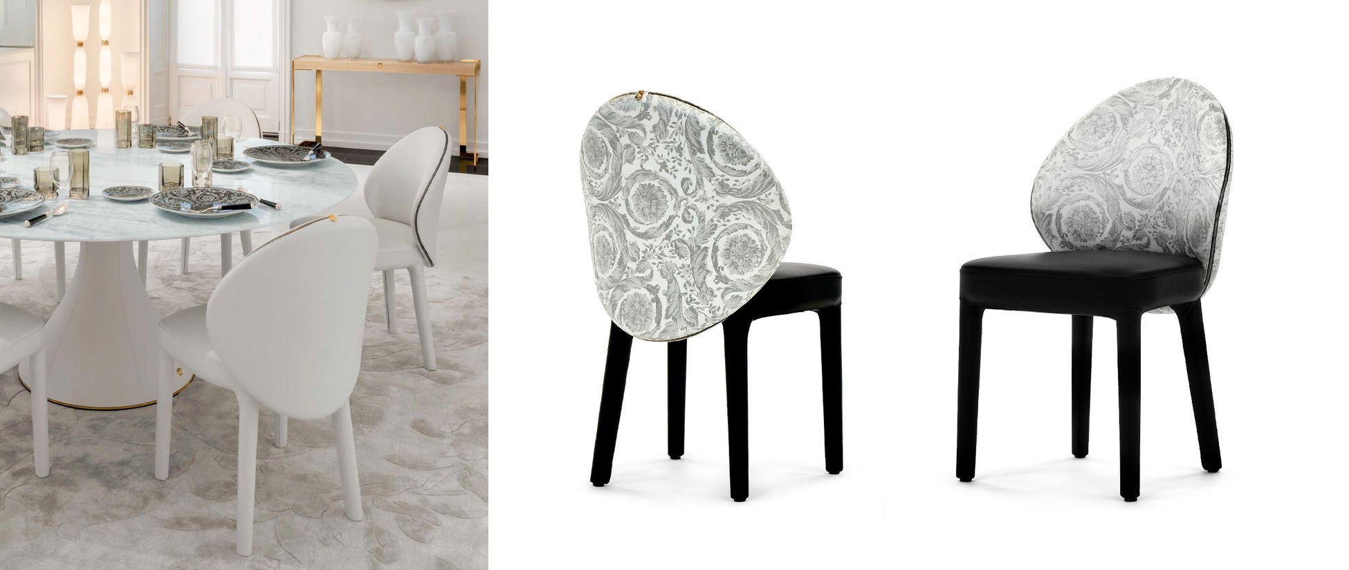 この度の展示モデルは、新作ソファや豪華な新ファブリック、大理石の新素材をお確かめ頂けます。ゴールドやクロムシルバーの金属パーツが華やかな存在感を放つ「Iconic(アイコニック)」ソファ、古代彫刻のようなフォルムが特徴の「Zensational(ゼンセーショナル)」ソファには、新たにクロコダイル型押しレザーが加わり、ラグジュアリーな質感をさらに高めています。「Via Gesù(ヴィア・ジェズ)」コンソールは、希少なカルサイト大理石の天板が、空間に洗練された華やぎを添えます。「La Medusa(ラ・メドゥーサ)」チェアには、バロッコ柄のジャガード織生地とゴールドジッパーのディテールがヴェルサーチェらしい圧倒的な存在感を放つ一脚です。